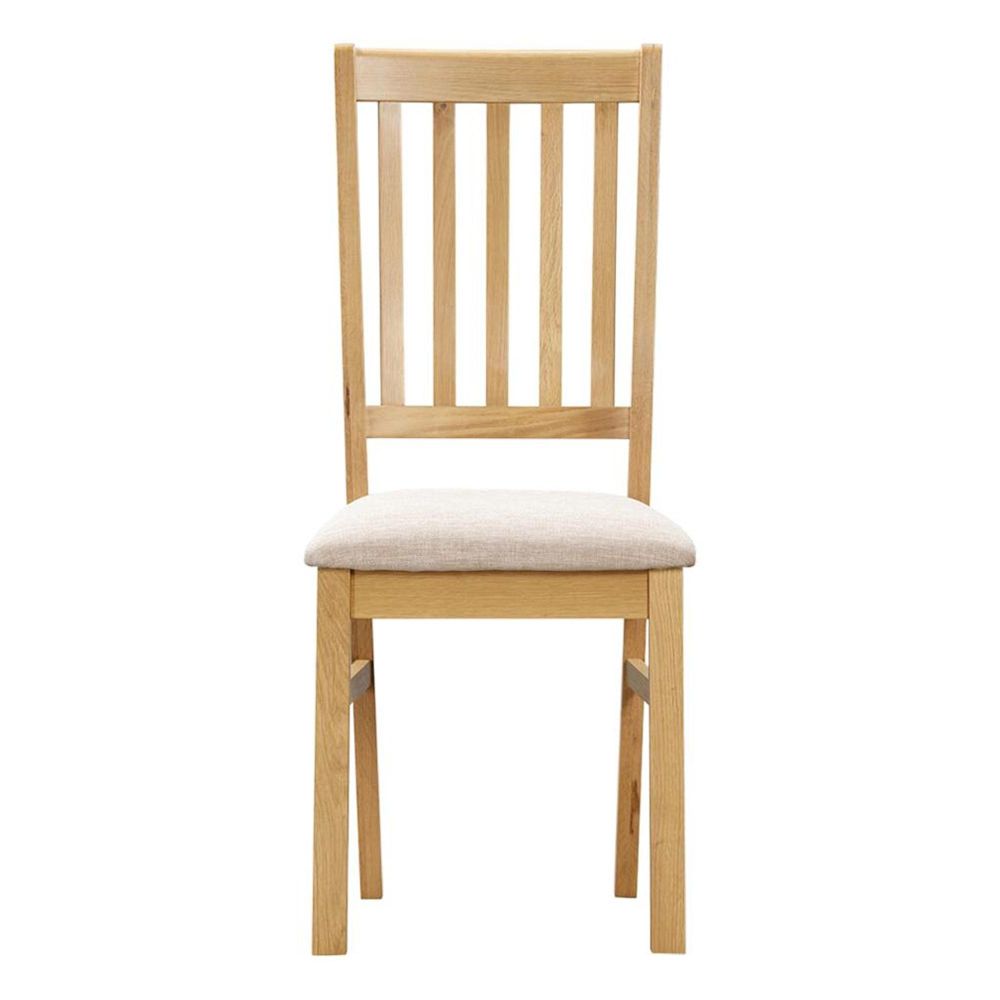 The square table comfortably seats two, but with four padded fabric seat chairs, it adapts beautifully to larger households or when entertaining guests. The slatted back chair design offers both support and comfort, making mealtimes a pleasure.