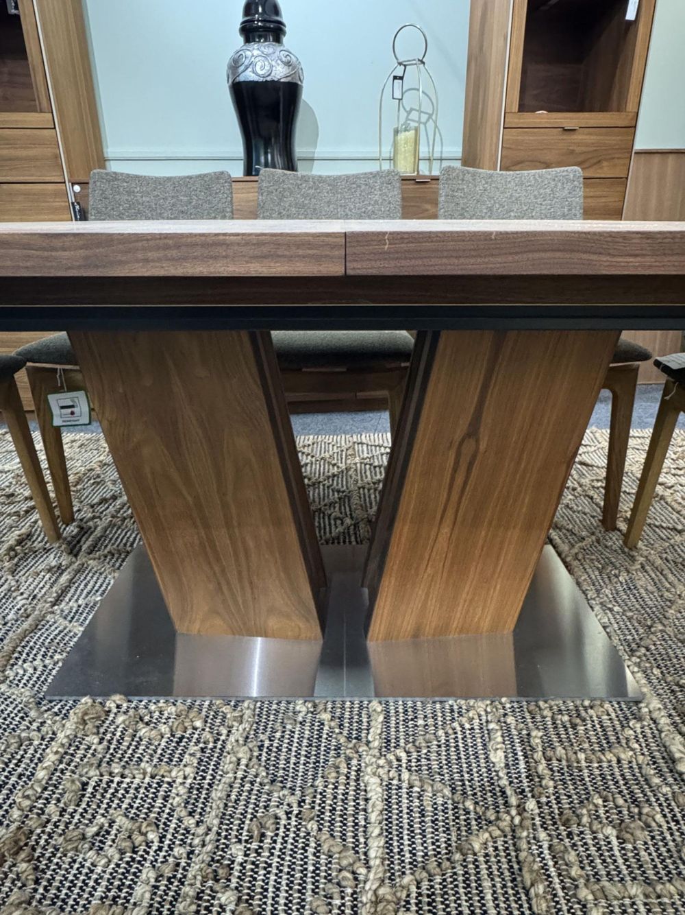 Please note: Images are used for illustration purpose onlyItem looks as accurate as your browser allowedThis item is listed as ex-display and available on first come first serve basis once ordered can not be cancelled.Skovby SM37 dining tablekovby SM37 dining table in a very characteristic designThe Skovby SM37 dining table has a very characteristic design with a sculptural V-shaped base and a dynamic appearance.The advantage of this base is that you can place the chairs around the table as you please, without having to consider the table legs.The Skovby SM37 dining table has the capacity to seat six people in its basic position.The table has two extension leaves stored under the tabletop ? and fully extended it will seat twelve people.Made in DenmarkSkovby furniture is made in Danmark. We select and evaluate the quality of the wood in relation to grain patterns, play of colours and structures. Skovby only use high quality veneer and solid wood.Product CareImproper care and maintenance can damage your furniture!Far too many of the problems that arise with furniture, is a result of improper maintenance and/or as a result of an inaccurate or incomplete information when purchasing the furniture.Please follow the recommendations as to daily care and maintenance of your Skovby furniture.Design by functionDesign by function has been the Skovby design principle for decades starting with the very first "pull-and-unfold" table in 1974. Design by function is the art of designing furniture with product functionality as the main driver and inspirational starting point.Ergonomically correct dining chair with an amazing seating comfortSkovby SM63 dining chair with an amazing seating comfort. The SM63 dining chair is designed to match the dining tables Skovby SM26 and Skovby SM27, but does of course match other Skovby tables as well.The ergonomically correct, upholstered back of the Skovby SM63 dining chair provides an amazing seating comfort and makes it pleasant to be seated at the dining table even after some time.Wearability and stabilityThe Skovby chairs are ergonomically designed to offer the best possible comfort and comply with the most stringent international regulations. All our chair designs are regularly tested at The Danish Furnituremakers Quality Control, where among other rigorous tests they are subjected to 50,000 tilting pressures. Our chairs are therefore categorized to be within the highist quality level for dining room chairs. Fabric or LeatherWe only sell extremely hard wearing covers that comply with the most stringent quality standards.Good CraftmanshipSkovby furniture design builds on 80 years of experience with furniture production and a solid and strong opinion on raw materials, production and design. Our company is 100% danish and our furniture 100% danish design.