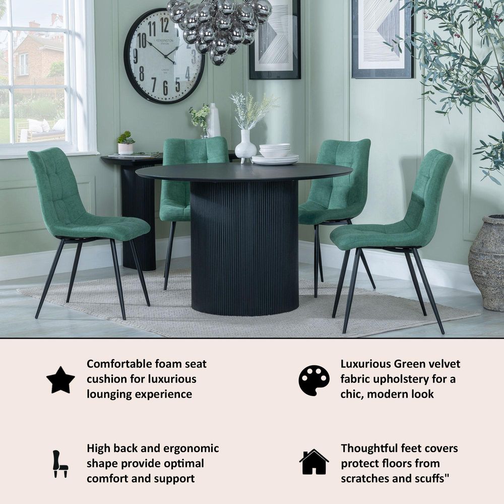 Bern Fluted Black 4 Seater Round Dining Set - 4 Corona Green Fabric Chairs