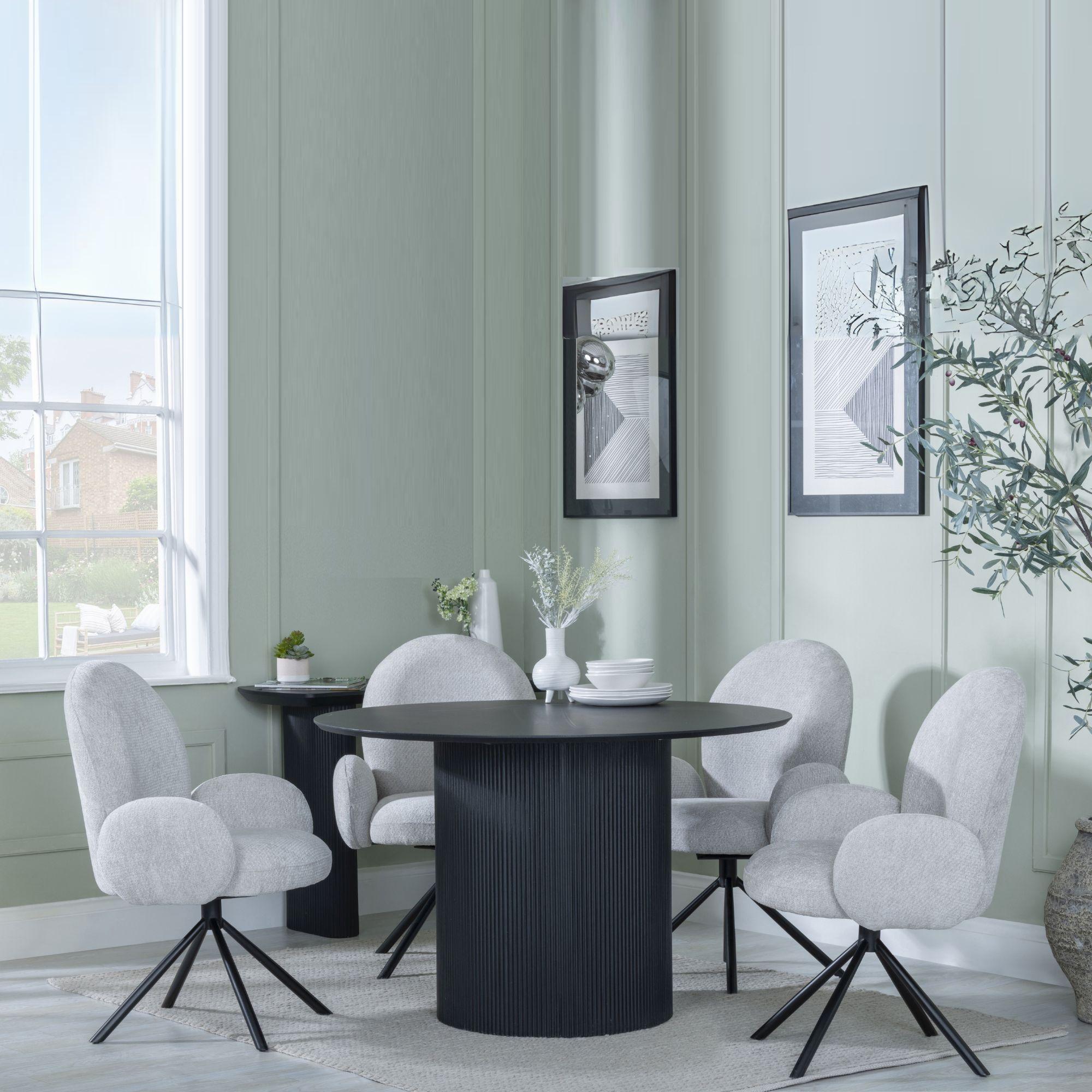 Bern Fluted Black 4 Seater Round Dining Set - 4 Theo Grey Fabric Swivel Dining Chair
