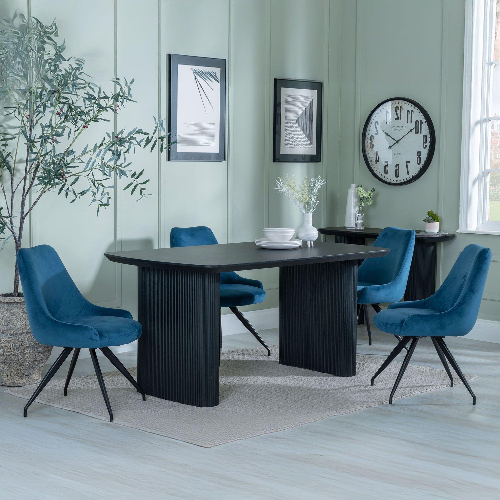 Bern Fluted Black Dining Set - Arctic Blue Velvet Fabric Swivel Dining Chair