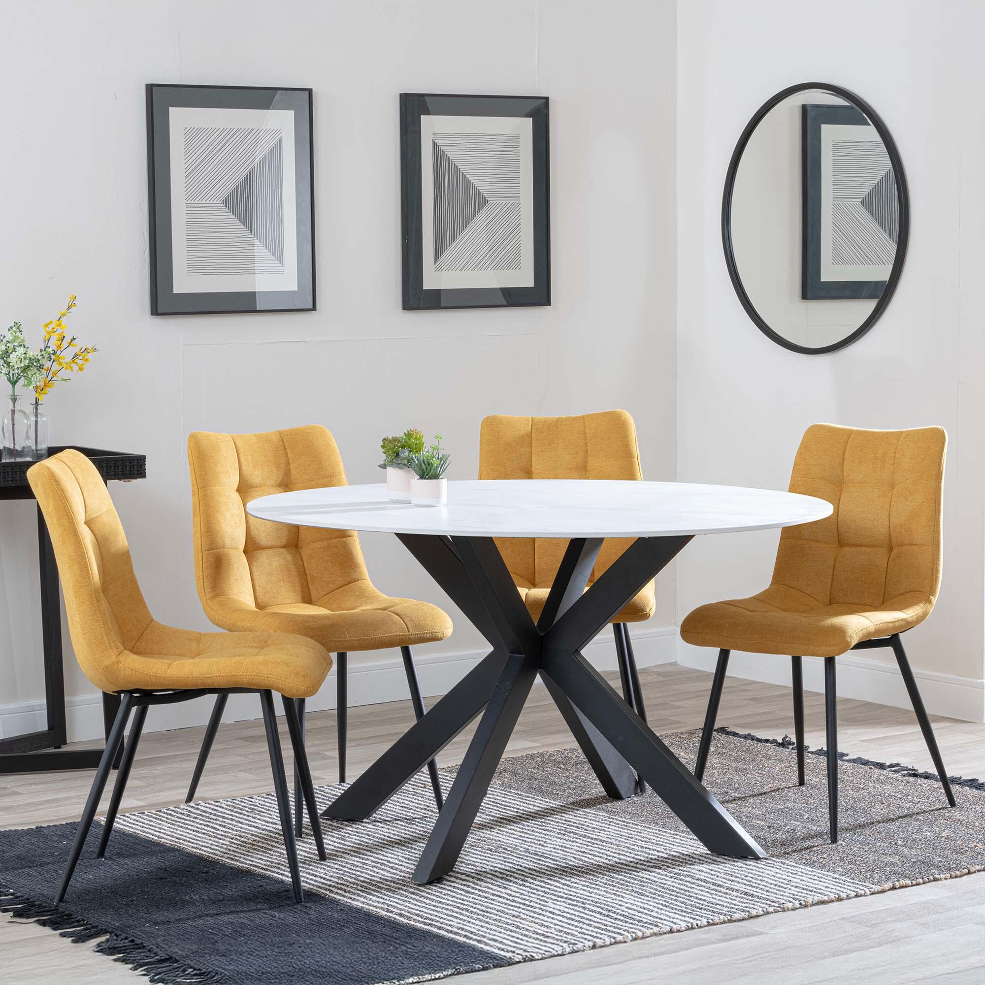 take a look at the Novara Matt White Ceramic Top Round Dining Table from Humz, reflecting elegance and simplicity. crafted with a smooth, matt white Ceramic top, 12 mm thick, it combines durability with a sleek finish. The 130 cm diameter will easily fit up to 4 people. It has a very clean and modern look with its round design and fixed top, hence it fits in any dining space. It features black spider legs that strikingly contrast with the white top, making this table sleek and modern. It is the ideal round dining table with Dimensions are 130cm x 130cm x 75cm; it's compact but enough to fit your family meals and small gatherings. This flat-packed table will be easy to assemble, thus not only beautiful but also very practical. The Novara table mixes classic style and modern functionality for everyday use and special occasions.