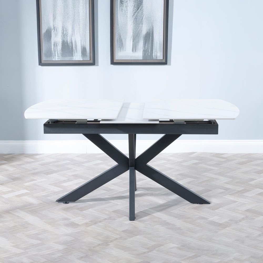 Take a look at the Bari Matt White Ceramic Top Extending Dining Table by Humz: this is chic, versatile, and is sure to decorate your dining room with beautiful style. This gorgeous table features a matt white Ceramic top in a 12mm thickness for added durability and style. The table will extend easily from 140cm to 180cm with two middle extension panels, accommodating up to 8 guests during larger gatherings. When closed, it can seat 4 comfortably, so ideal for everyday meals. The striking black spider legs add striking modern contrast to the white top. Adding sophistication to any room with dimensions 140cm x 90cm x 75cm closed and 180cm x 90cm x 75cm extended. Its sleek, modern design gives it a simplistic, practical approach to improving home decor.