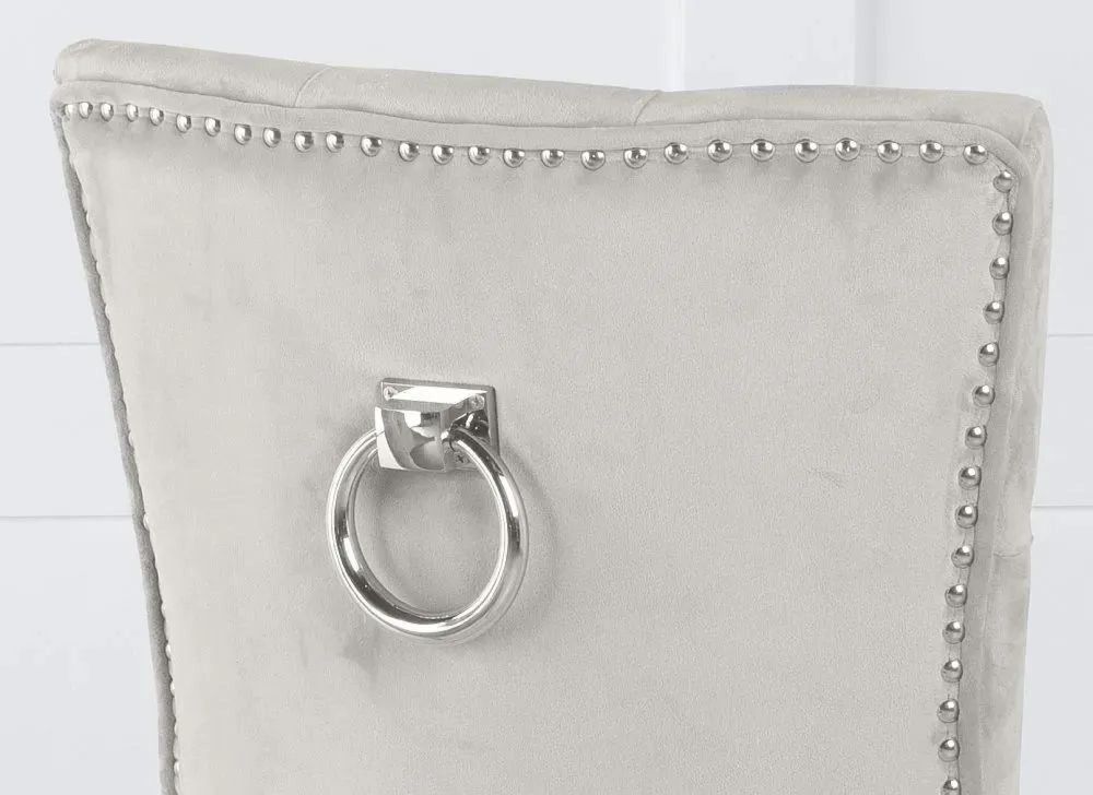 Glacier Grey Marble and Chrome Dining Set - Knocker Back Champagne Velvet Fabric Dining Chair with Chrome Legs