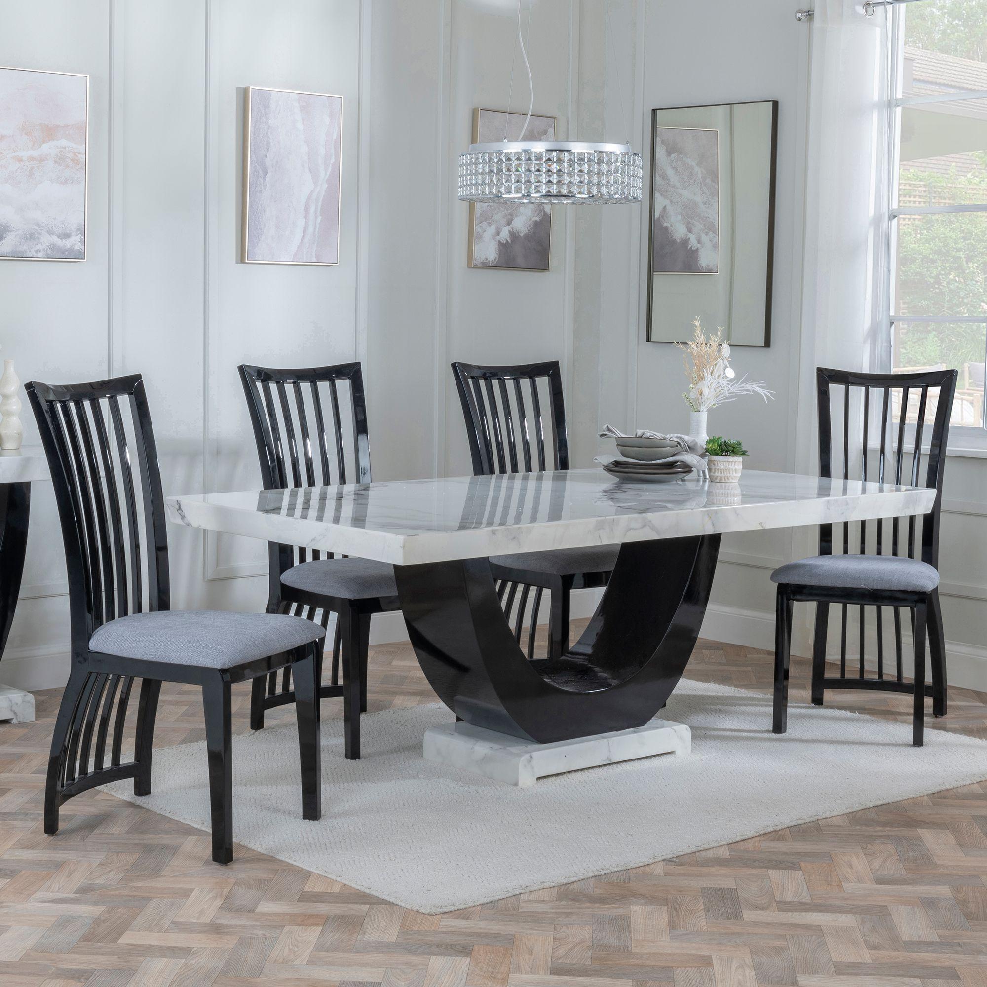 Madrid White Marble Dining Set - Athena Black High Gloss Slatted Back Dining Chair with Grey Seat Pads