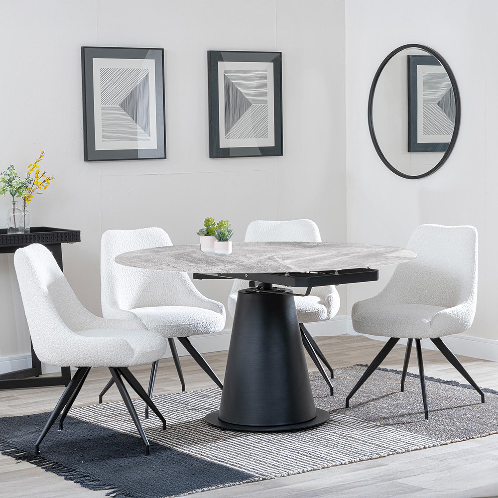 Carrara Grey Ceramic 4 Seater Round Extending Dining Set - 4 Arctic Cream Velvet Fabric Swivel Dining Chair