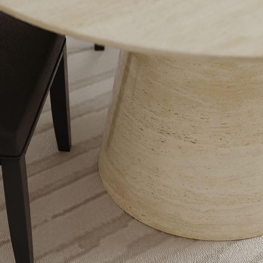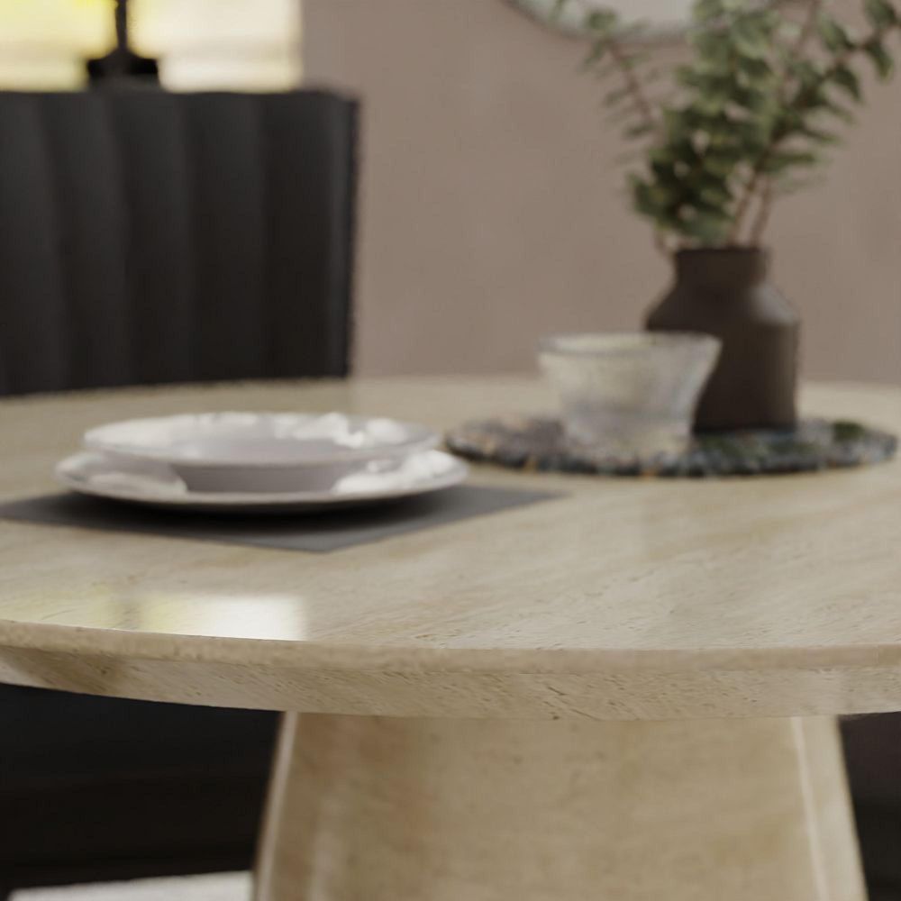 A sculptural, cone-shaped pedestal base supports the marble top, offering both visual appeal and outstanding stability. Its design maximises legroom for comfortable seating, while the solid construction ensures lasting durability. The polished surface is easy to clean, allowing this table to maintain its sophisticated look through everyday use.