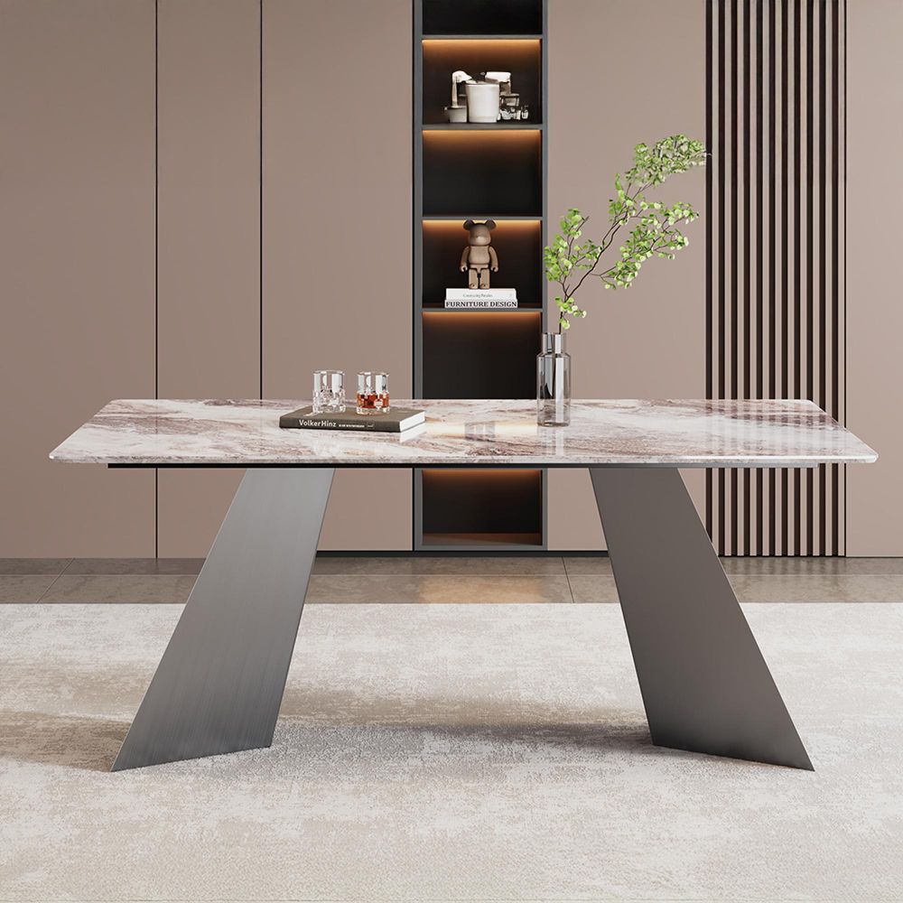 The rectangular table features a beige marble-effect top with soft veining that mirrors the natural character of stone. Each surface has its own unique pattern, giving the table a premium, crafted feel. The smooth finish is easy to live with, making it practical for daily use without losing its visual appeal. Supporting the top is a bold pedestal base formed from polished stainless steel, finished in chrome. The angled, geometric design adds stability while introducing a clean, architectural look that complements modern and minimalist interiors.