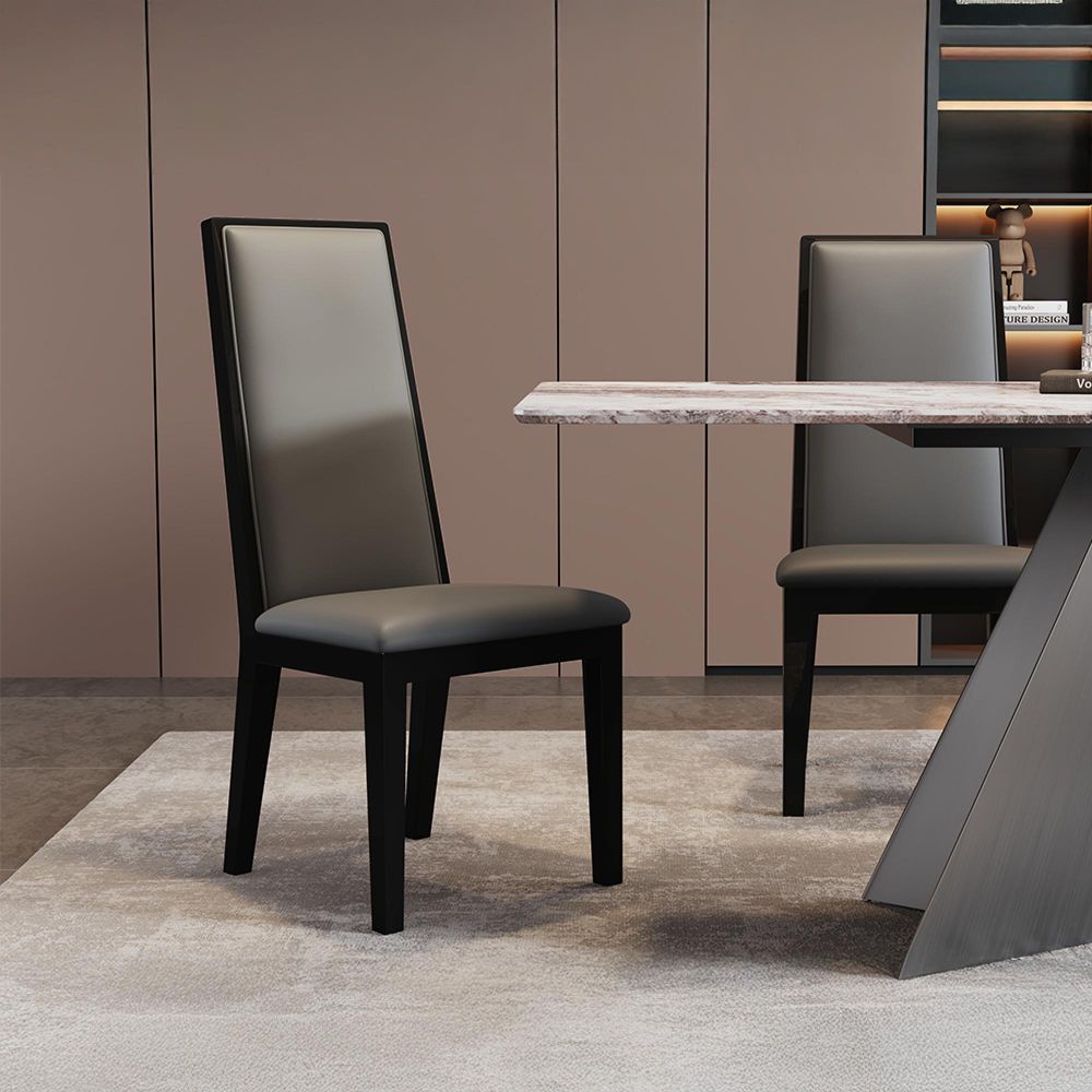 - Elite high-back dining chairs upholstered in durable grey faux leather
