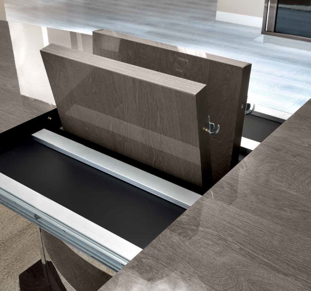 Dining TableTable base structure: 18mm thick wood particles panels veneered with semi-gloss silver birch melamine finish with MDF (Medium Density Fiberboard) chromed inserts. Solid fir wood frame with low friction ball-bearing hot dip galvanized steel sliding mechanism. Table top: ultralight 40mm virgin white poplar wood particles panel veneered with semi-gloss silver birch melamine finish (Camelgroup exclusive). 95 gloss polyester curtain coating with UV (Ultra Violet) drying process. Butterfly table extension folds away and is perfectly hidden in the base of the table.Steel Hardware and Wood Dowels: Solid beech wood dowels 10mm x 40mm. Carbonitrided and galvanized steel with zinc alloy patented joints guarantee certified strength and hold. Hinges are certified in compliance with DIN ISO 9001 quality standard. They are subject to static load test (positive opening capacity), wear/durability tests (100,000 cycles of opening and closing with the added load 2x20N), safety testing and salt water resistance and condensation testing.Other Characteristics: Ultralight virgin white poplar wood particles panel adhere to E1 low formaldehyde emission standard as per UNIEN120 directive.Care and Maintenance: Surfaces must be cleaned with soft cloth and neutral liquid detergent. Wash and dry carefully. Do not use powder or abrasive products. Do not use products containing alcohol or solvents. In order to avoid damages do not load weight on doors nor force over-opening or strain on hinges. Avoid prolonged direct exposure to sun light, this might cause discoloration which cannot be regarded as a defect. Do not place the furniture close to heating sources or in humid places for a long periods.Dining ChairPlatinum in beech wood. Four coats polyester finish 100 gloss and chrome insert. Platinum with padded back "Rombi" Nabuk upholstered Chair.Dehydrated and stabilized (12% residual humidity) solid beech wood frame. Double electrostatic automated acrylics base. Hot air tunnel drying. Back and seating panel: 12mm thick wood particles panel upholstered with DS35 density elastic polyurethane padding for comfort and durability..Handmade upholstery: Fire-retardant PVC (Made in Italy). Backs upholstery finish available with "diamond" stitching (Rombi).Steel Hardware and Wood Dowels: Solid beech wood dowels 10mm x 40mm. Carbonitrided and galvanized steel with zinc alloy patented joints guarantee certified strength and hold. Hinges are certified in compliance with DIN ISO 9001 quality standard. They are subject to static load test (positive opening capacity), wear/durability tests (100,000 cycles of opening and closing with the added load 2x20N), safety testing and salt water resistance and condensation testing.Other Characteristics: Ultralight virgin white poplar wood particles panel adhere to E1 low formaldehyde emission standard as per UNIEN120 directive.Care and Maintenance: Surfaces must be cleaned with soft cloth and neutral liquid detergent. Wash and dry carefully. Do not use powder or abrasive products. Do not use products containing alcohol or solvents. In order to avoid damages do not load weight on doors nor force over-opening or strain on hinges. Avoid prolonged direct exposure to sun light, this might cause discoloration which cannot be regarded as a defect. Do not place the furniture close to heating sources or in humid places for a long periods.This is a Made to Order itemAll Made to Order items are manufactured as per the order supplied by you.We are unable to accept cancellation or accept any extra cost that may incur due to wrong information provided by you at the time you placed the order.We will confirm all sizes/colours/finishes in written email (order confirmation) with you before going ahead with production of your order.