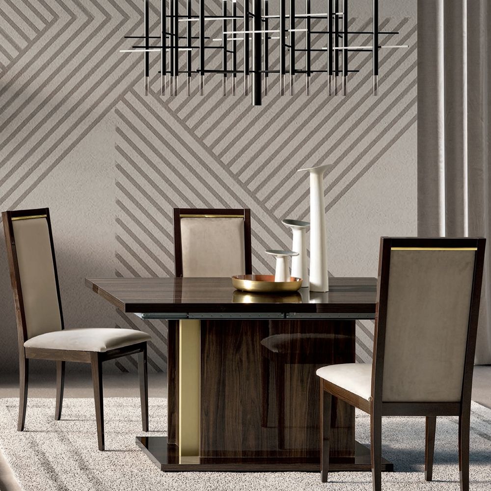 Item Code: 159TAV.03NP/135SED.02NPMS359 Rectangular 140cm table with 45cm extension and Roma liscia chair upholstered in Scarlet 09 Fire Retardant fabric.Warm shades of Patrizio walnut finish with streaked wood pattern give elegance and modernity to Volare collection. Original triangle cut handles in bleached, satin and brushed gold finish with matching plinths.This is a Made to Order itemAll Made to Order items are manufactured as per the order supplied by you.We are unable to accept cancellation or accept any extra cost that may incur due to wrong information provided by you at the time you placed the order.We will confirm all sizes/colours/finishes in written email (order confirmation) with you before going ahead with production of your order.