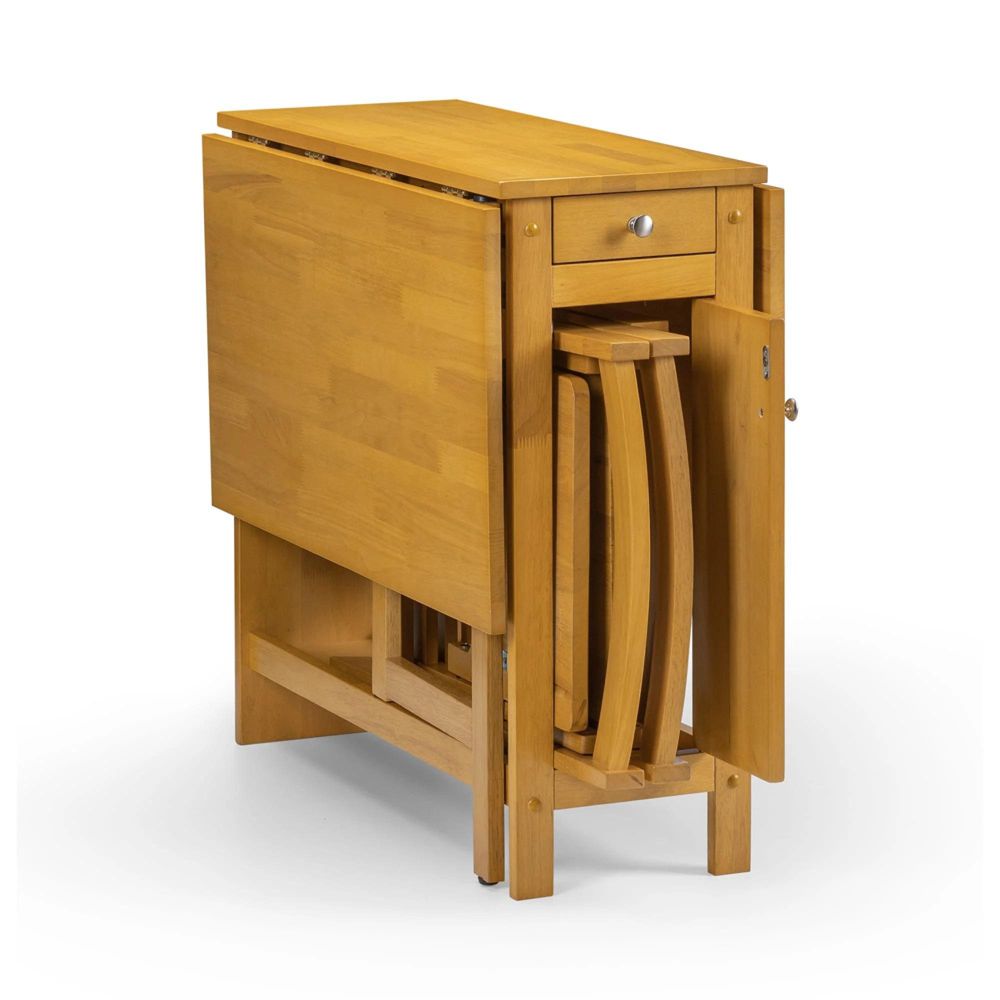 Item Code: SAV101 A Neat and Functional, Space Saving Dining Set where the Chairs can be Folded and Stored Inside the Table, Available in a White and Natural Finish and an All Over Light Oak Finish.