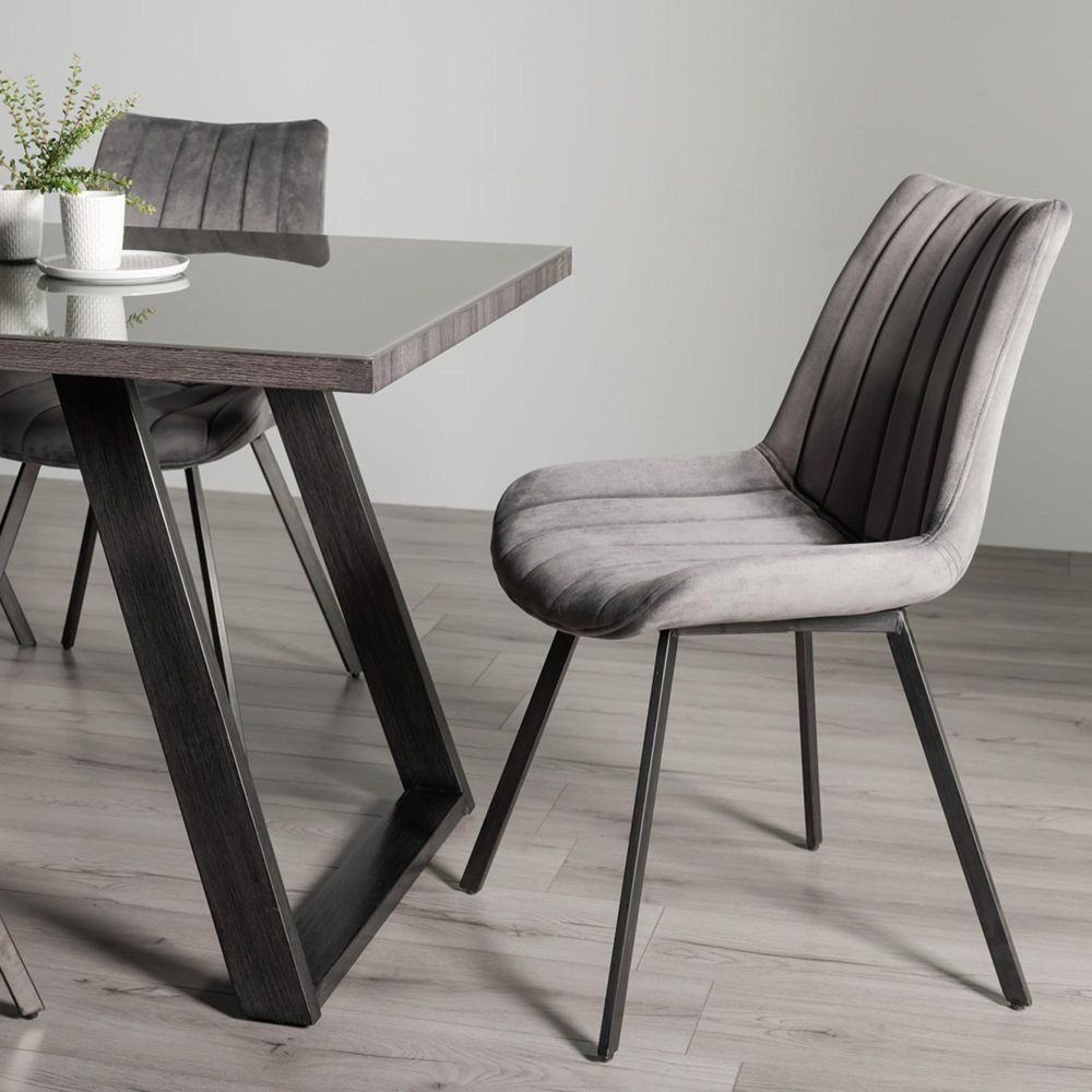 Hirst Grey Painted Glass Dining Table Set - 6 Seater - 90cm - 6 Fontana Grey Velvet Chairs