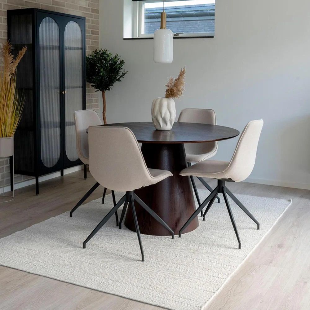 Made from high-quality MDF and premium wood veneer, the Bolton table offers both strength and refined visual appeal. The smooth round tabletop sits on a cone-shaped pedestal base, providing excellent legroom and a clean, uncluttered look. This version is supplied as a dining set with Zebulon Sand Swivel Chairs, featuring bucket-style beige upholstered seats and a contrasting black swivel base for added comfort and modern practicality.