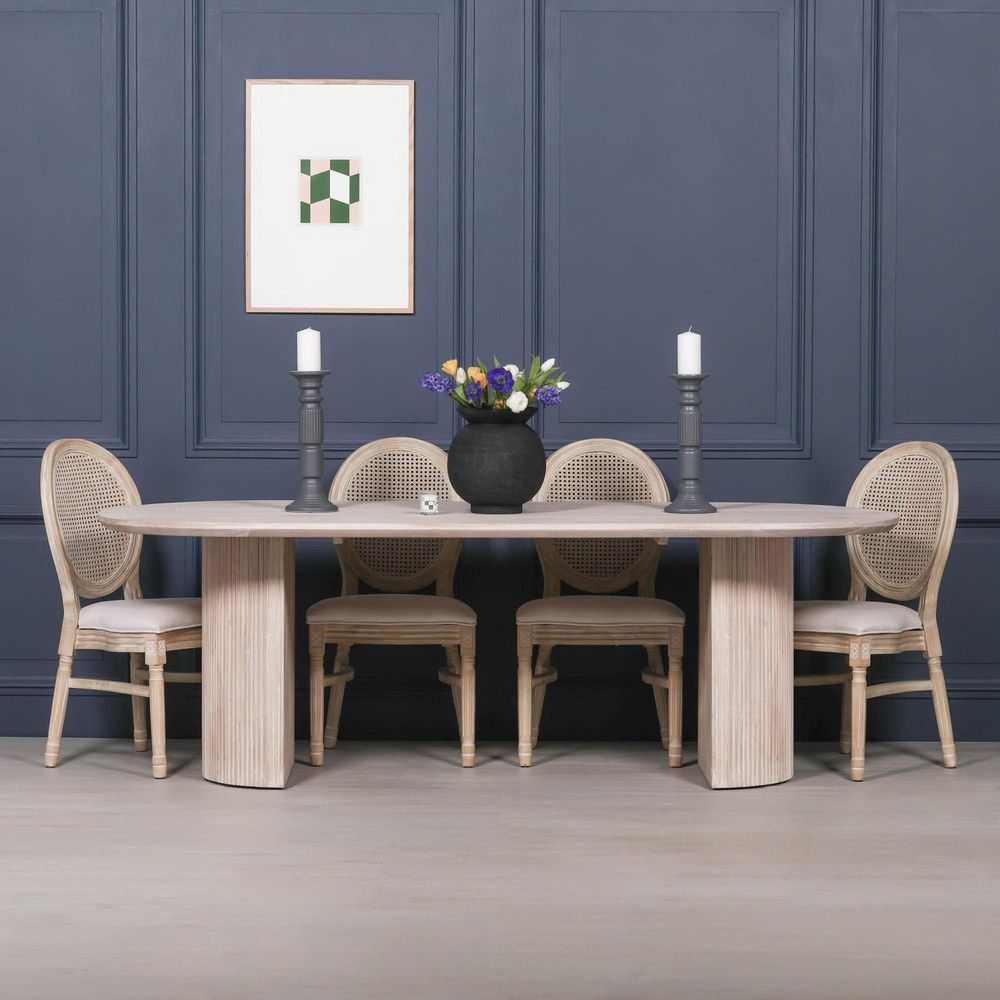 Item Code: GMF151 Hand-crafted fluted acacia wooden oval 6 seater dining table in a bleached washed wood finish.