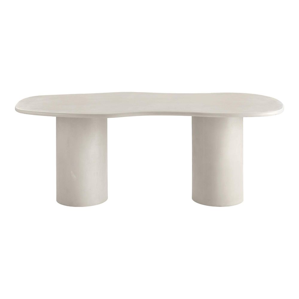 The organically shaped tabletop features a smooth light grey concrete finish, crafted from high-quality MDF for durability and a premium look. Supported by a double pedestal base, the design balances strength and visual lightness, giving the table a sculptural yet grounded appearance. Its neutral tone pairs effortlessly with a wide range of seating and décor styles.