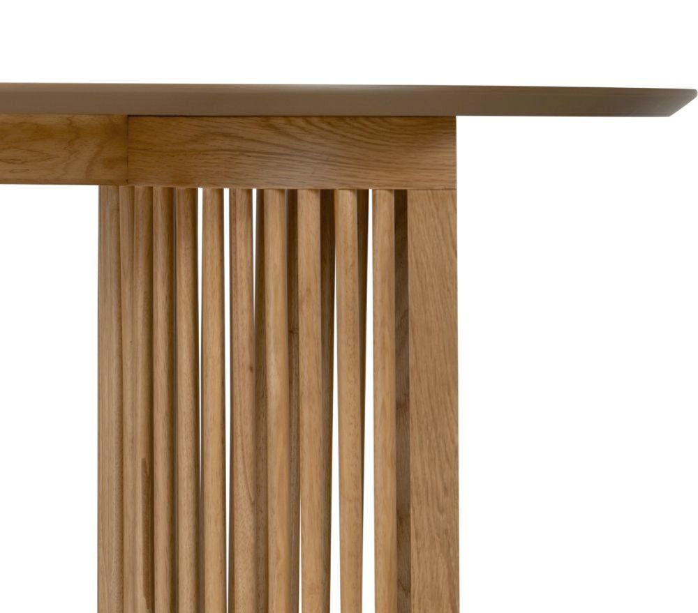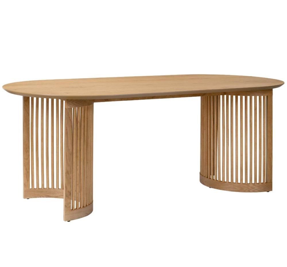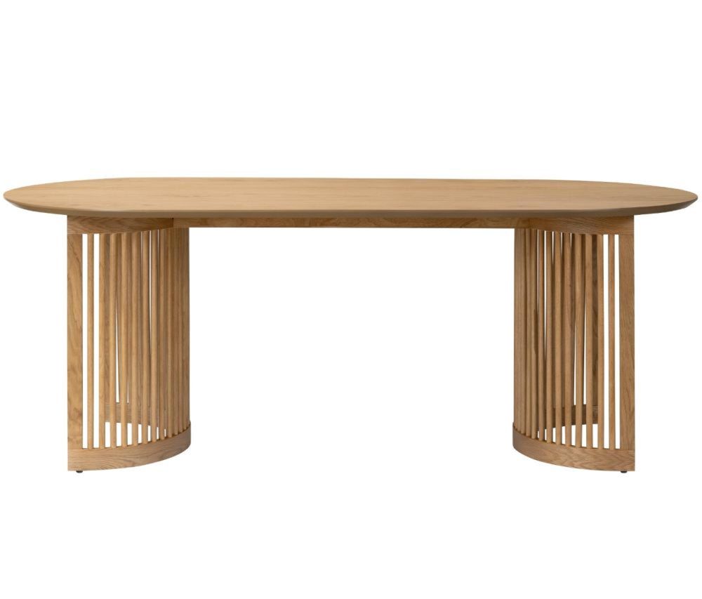 The defining feature of this piece is its slatted double pedestal base, an eye-catching design element that adds structure and texture while keeping the table feeling open and light. The oval tabletop introduces soft curves that balance the solid oak construction, creating an inviting and elegant presence in any dining space. With its thoughtful proportions and elegant form, the Soho Oak Oval Dining Table combines functionality with timeless appeal. Every detail, from the precise joinery to the natural oak grain, reflects careful craftsmanship and a commitment to quality.