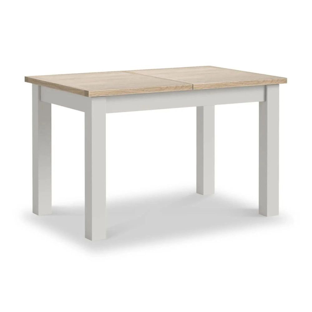 The solid white-washed oak top offers a premium natural surface that contrasts beautifully with the painted frame, available in Light Grey, Coconut White, or White-Washed Oak finishes. The table features a butterfly extension mechanism, allowing it to expand seamlessly from 120cm to 160cm. The central extension stores neatly within the table design, offering a clean and efficient solution when extra space is needed.