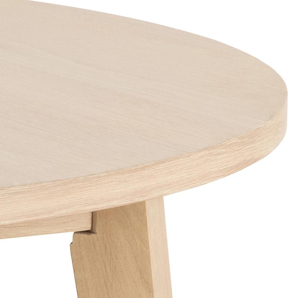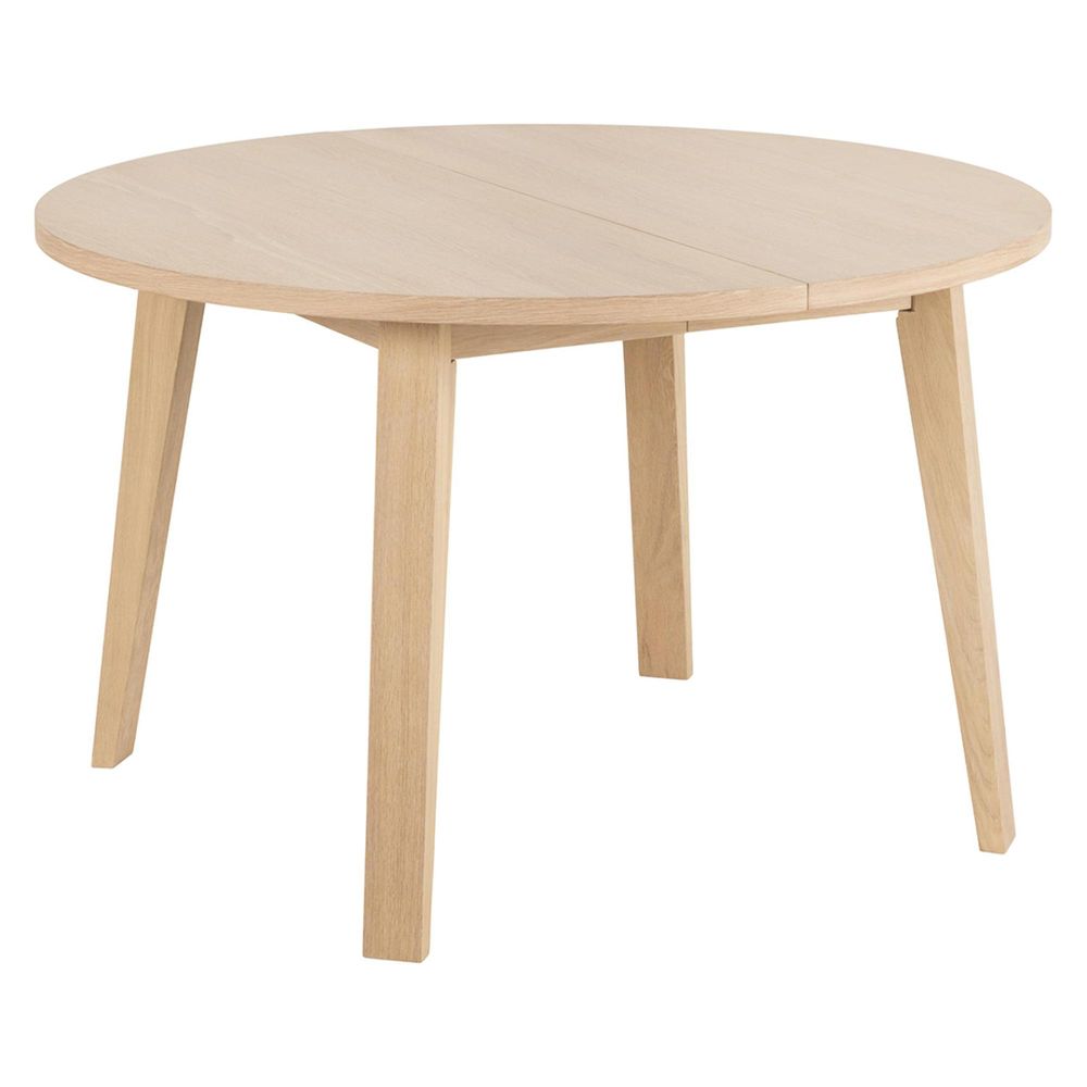 A-Line round dining table, top and base white pigmented oiled oak veneer, 120/220x75 cmThis round dining table is a modern take on a classic Scandinavian design. The slender profile has a lightweight and contemporary expression. Decorated with white pigmented oiled oak veneer, the tabletop has a natural texture, while the sturdy oak legs give a modern edge to the table. It seats comfortably 4/6 people without/with extension leaves.