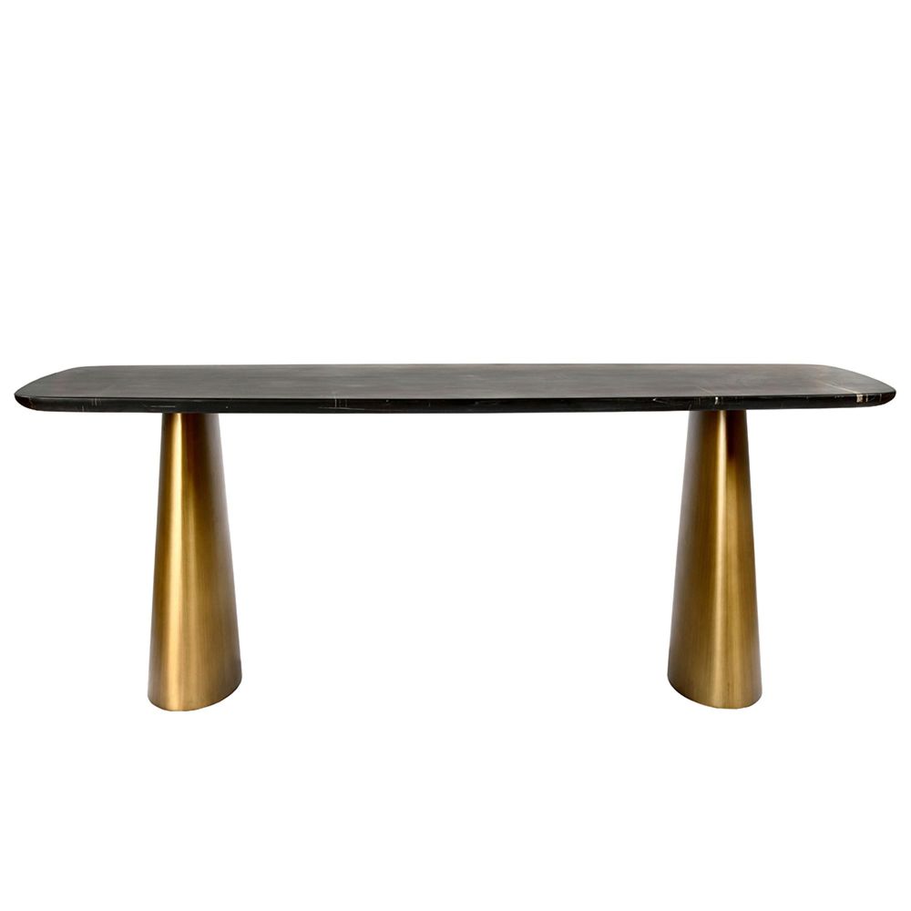 Item Code: 706467 Retro-infused luxury meets contemporary design. The Caldera Dining Table features a striking 32mm Black marble top, with a rich dark hue and natural veining, making every top unique. Its softened rectangular form rests on four sculptural, brass-toned metal pedestal legs, finished with a subtle patina. A harmonious blend of old-world elegance and modern craftsmanship, this elegant dining table seats 6 to 8 people.Free Delivery