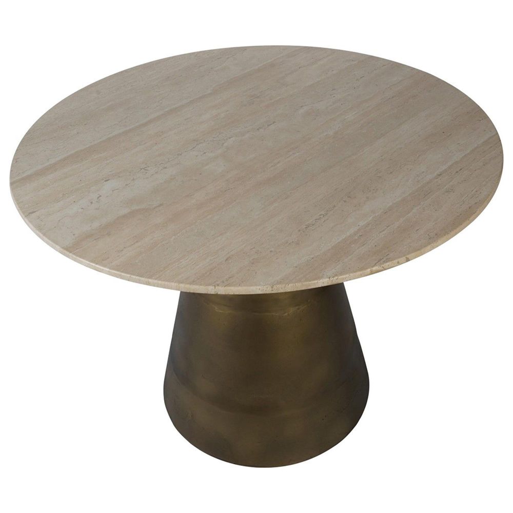 Item Code: 706500 Clifton II Light Travertine Round Dining Table pairs a smooth travertine top with a conical antique brass base for a timeless, contemporary feel. Beautiful natural travertine is filled with resin then set upon a cast aluminium brass finish base. Table seats four people. A natural companion to other pieces in the Clifton II collection, including the Coffee Tables (60cm & 75cm) and Side Tables (40cm in both Light Travertine and Dark Travertine finishes). This versatile centrepiece completes the look with refined coordination and material harmony. 120 x 120 x 75cm.Free Delivery