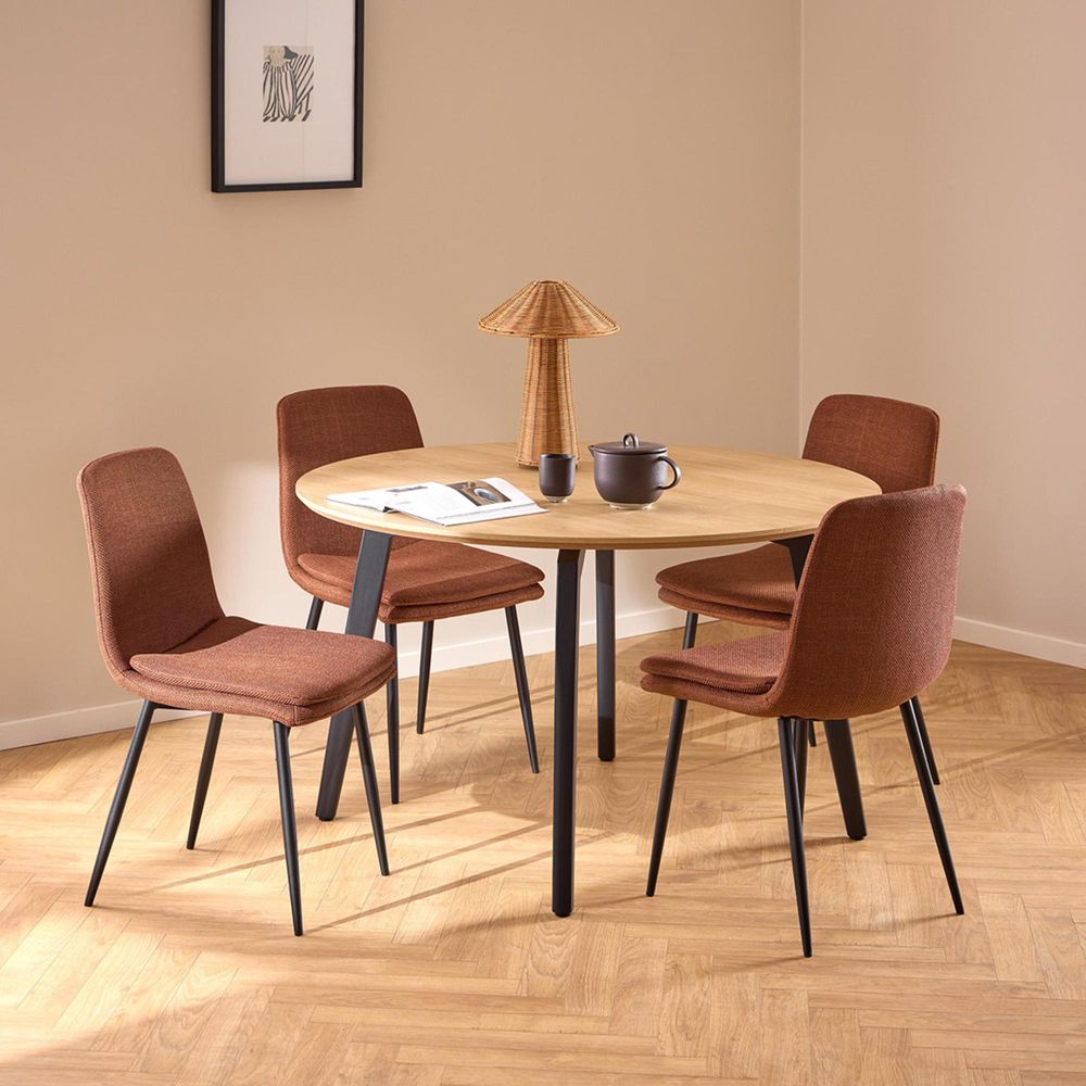 Cadiz round dining table, top oak rough melamine, base matt black rough powder coated steel, 120x120x75 cmSleek and practical in its design, this dining table is the perfect centerpiece in any dining room. Gather around the tabletop, boasting an oak look, that is perched on black rough powder coated steel legs. The round table accommodates 4 people for a fun dinner party or a casual Sunday brunch.