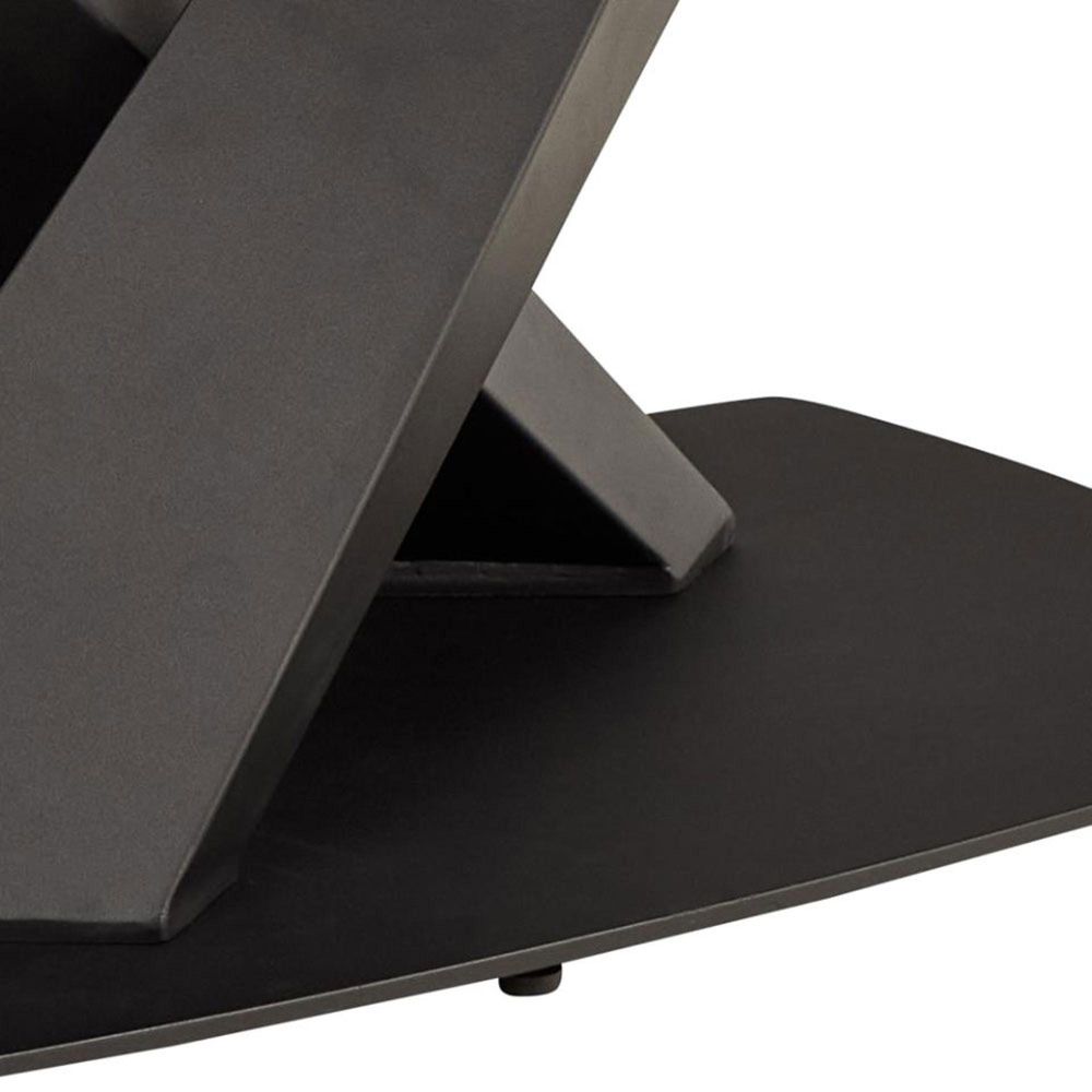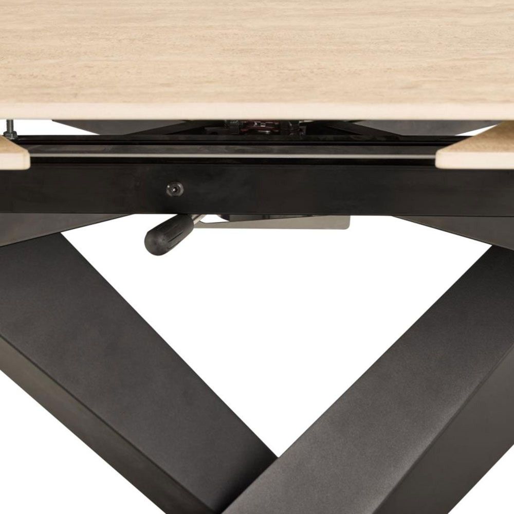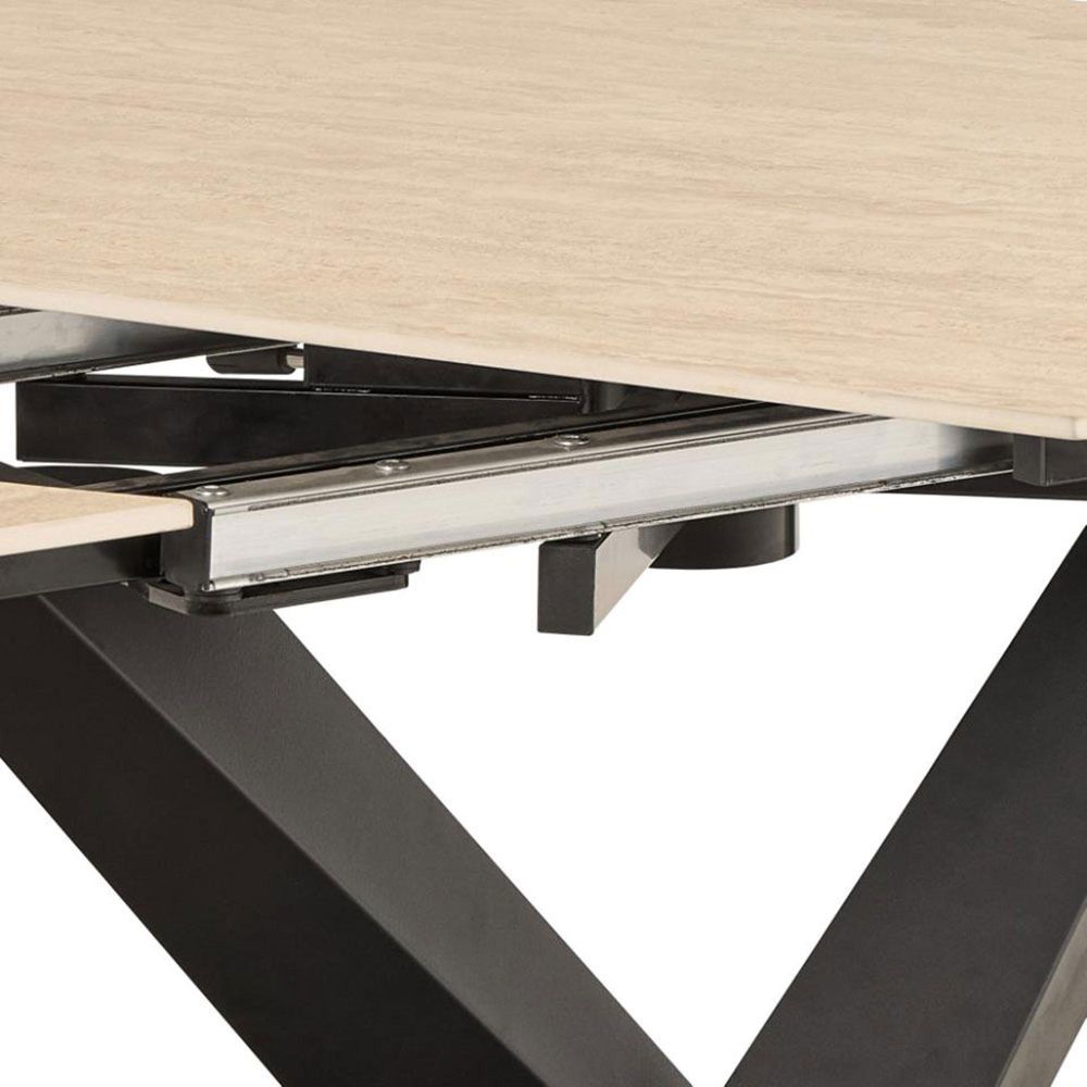 Morella oval dining table, top sand Marona rough ceramic, disc base matt black rough powder coated steel with extension leaf storage and rotation extension, 120/180x90x77 cmThis extendable dining table enhances any dining room with bold style and flexibility. With a black steel cross base and a practical sand-coloured ceramic top, the table is made of easy care materials and extends when you rotate the top. It is an ideal table for everyday dining and get-togethers alike. It comfortably seats 6 people.