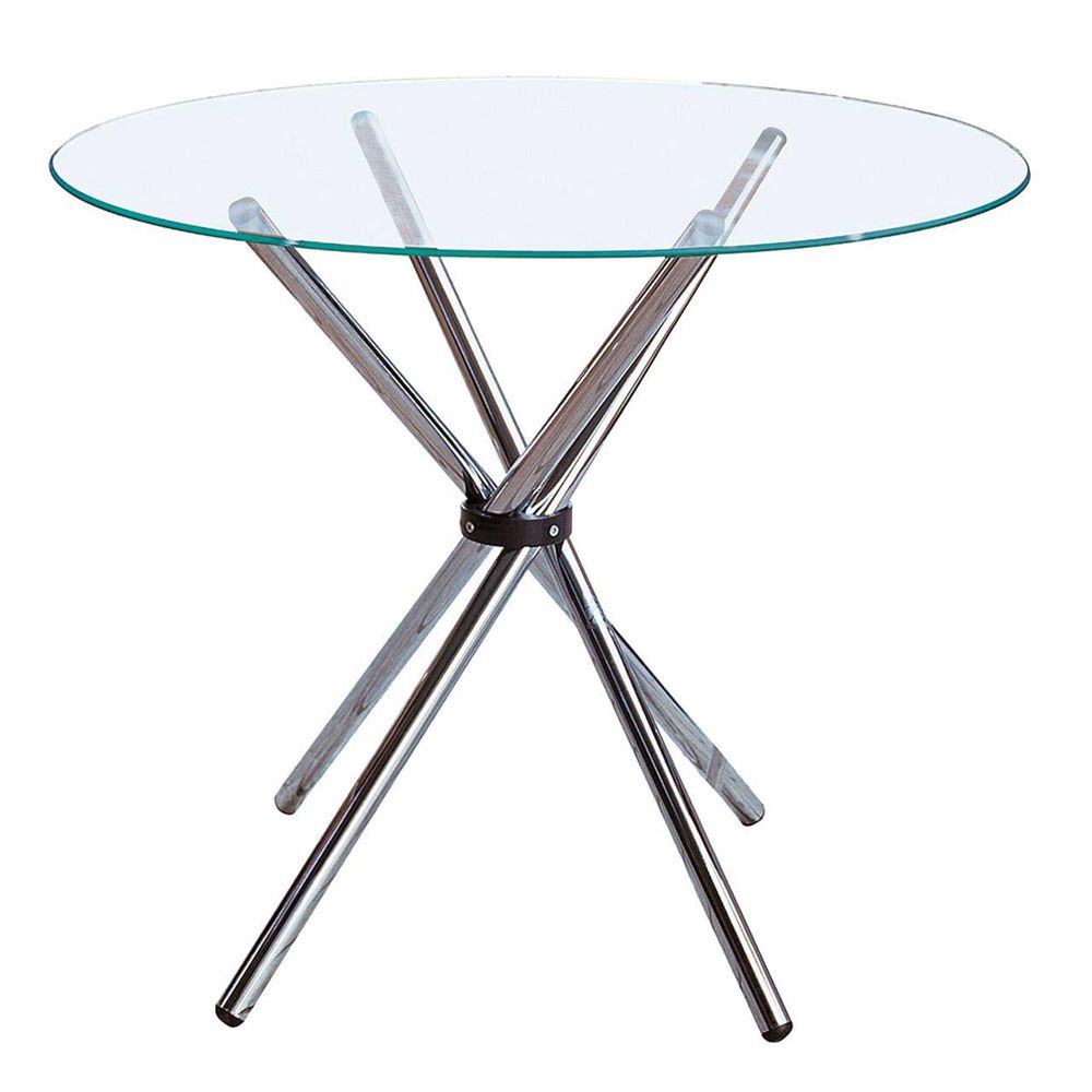 Item Code: 2401262 This dining table combines modern sophistication and elegance with intersecting chrome metal legs and a clear glass top.This dining table has a clear glass top that lends it a contemporary and airy feel. Made of metal, it features a cross base with four angular legs in a silver finish which add stability and provide a solid foundation to the glass top.Free DeliveryDelivery & Service Highlights:
