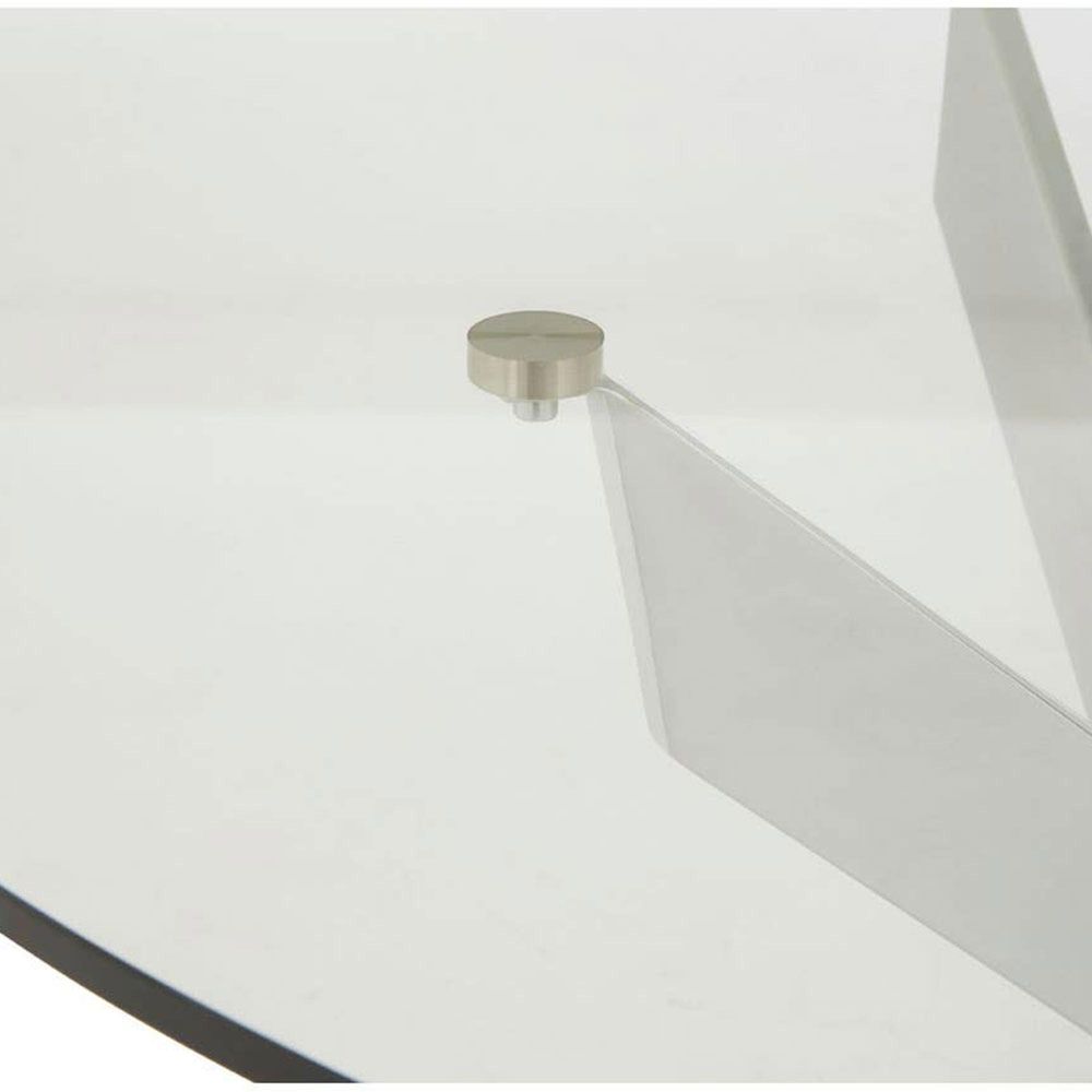 Item Code: 5501457 The Allure dining table has elegant bevelled legs made of chrome finish metal supporting a clear round glass top.This contemporary dining table features a rounded clear glass tabletop supported by four intersecting chrome metal legs. The sleek angular design and transparent glass will add a touch of modern simplicity to any space.