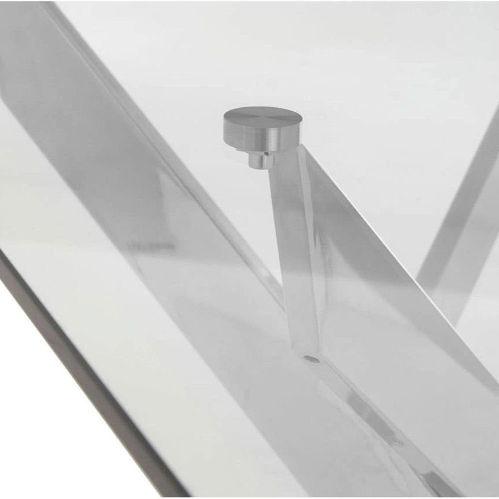 Item Code: 5501459 The Allure rectangular dining table has elegant bevelled legs made of chrome finish metal supporting a rectangular glass top.This contemporary dining table features a rectangular clear glass tabletop supported by four intersecting chrome metal legs. The sleek angular design and transparent glass will add a touch of modern simplicity to any space.