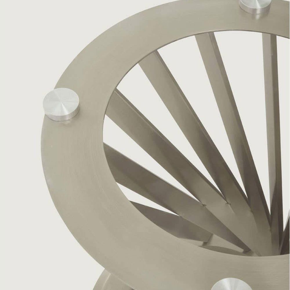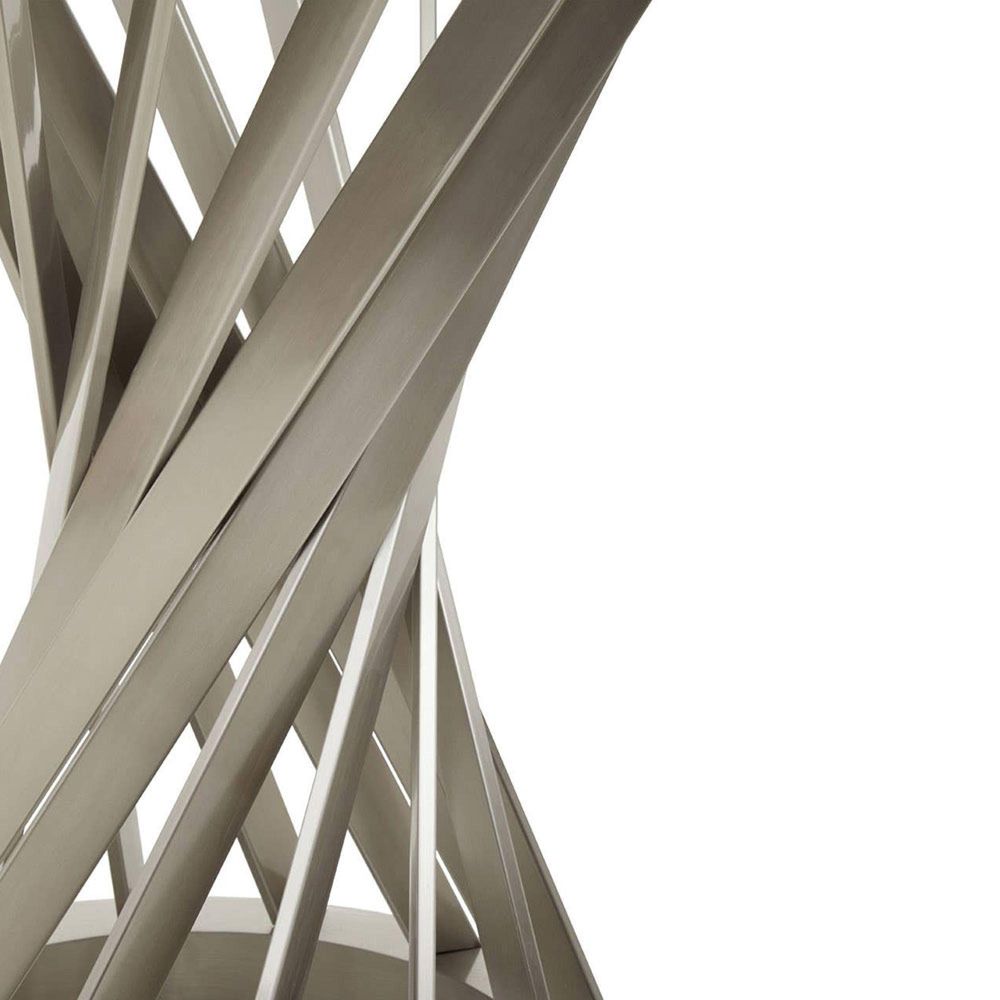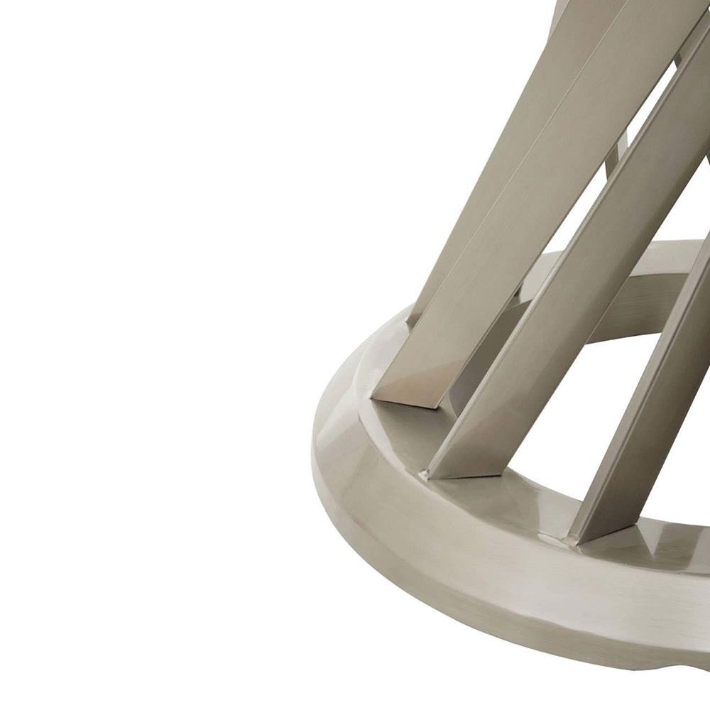 Item Code: 5527694 The Anzio dining table has a round clear glass top, supported by an hourglass shaped silver base.The Anzio dining table is the epitome of modern elegance. A simple clear glass top sits on top of a dramatic silver hourglass-shaped base.