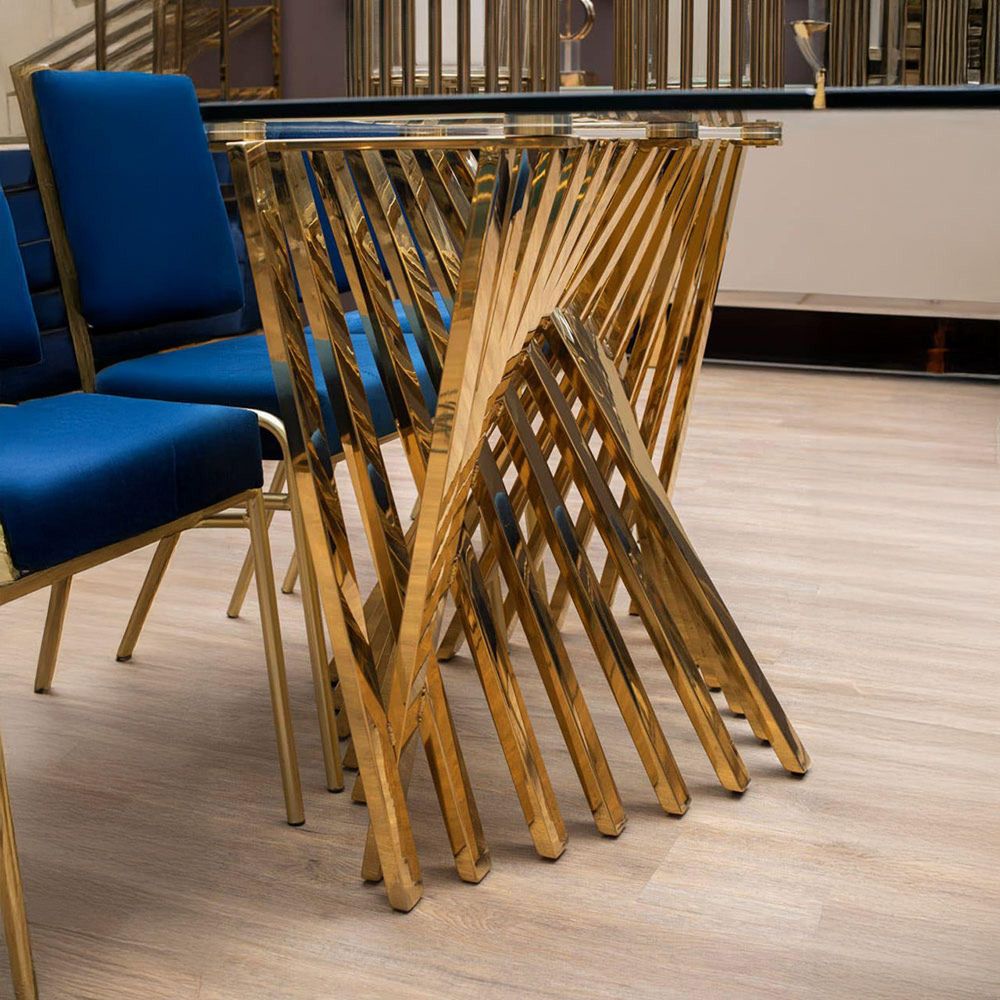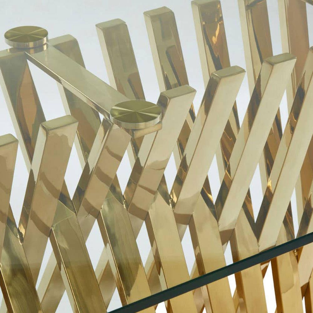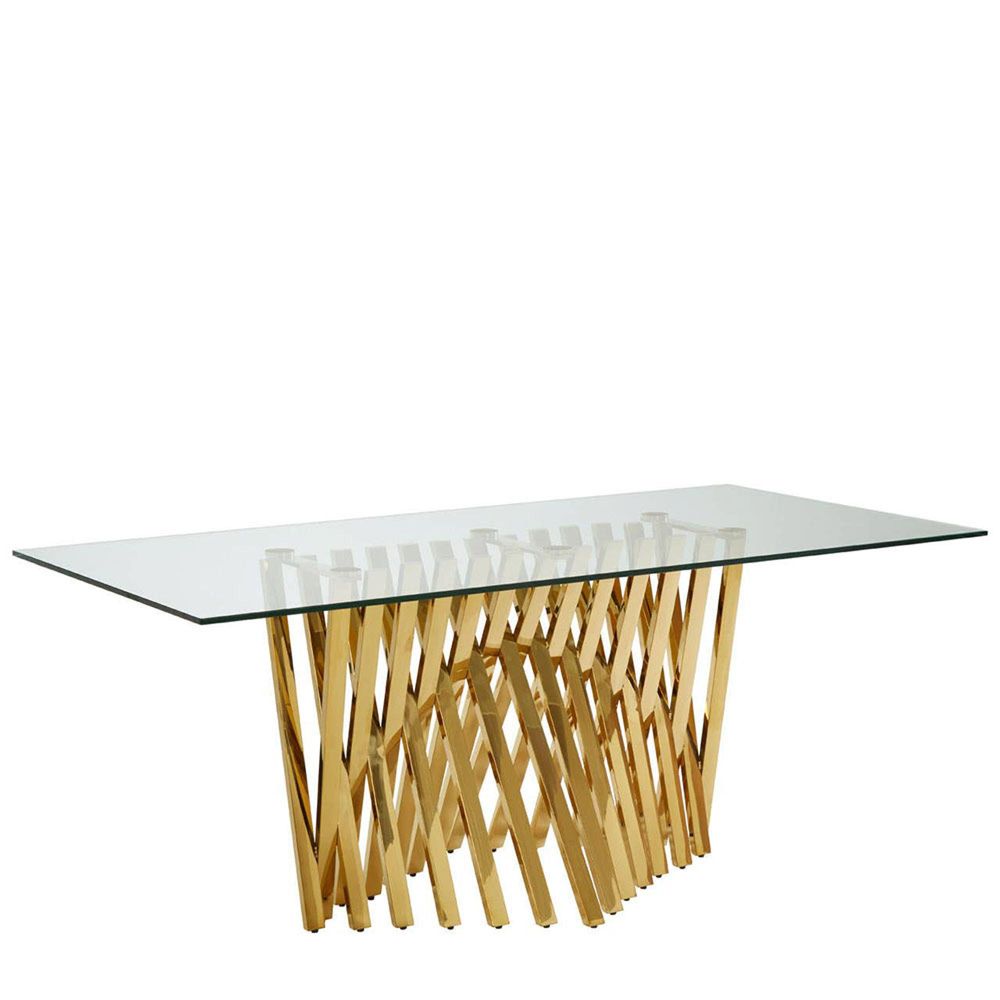 Item Code: 5501947 Make a contemporary luxe statement with the striking Arezzo dining table.A collection of smooth stainless steel stands support the table's rectangular top. Each one is coloured reflective gold. The top is made from tempered glass and has a clear finish that introduces a light, transparent element to the look.