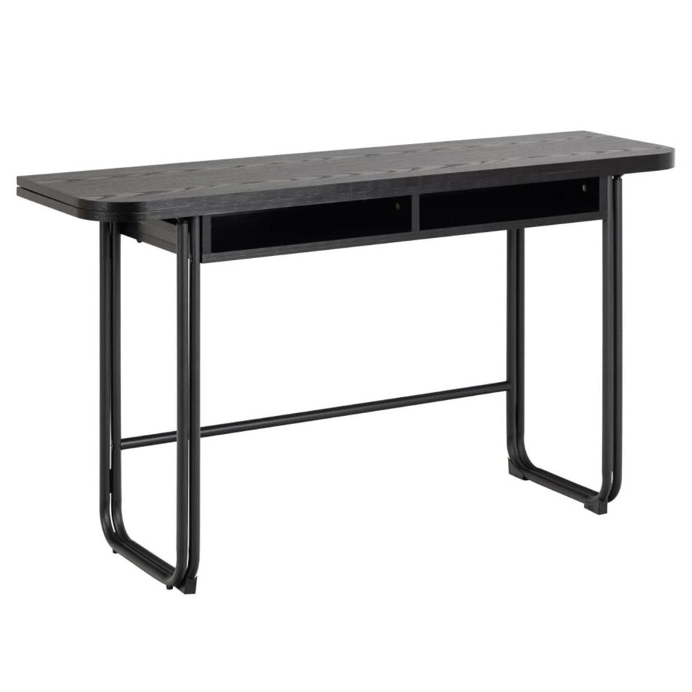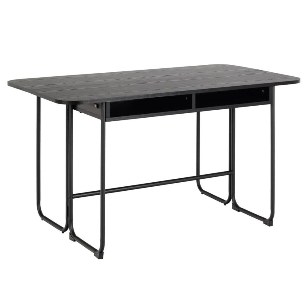Item Code: 104673 Darlington rectangular dining table, top ash black rough melamine, sledge base matt black rough powder coated steel with extension leaf storage and open compartment. Introducing a dining table that allows you to use space cleverly. Designed with an embedded extension leaf, the surface can be extended in width by 40 cm. It stands on a black tubular sledge base and supports the sleek top with a textured surface in a black ash decor. Place it in a space or by the wall - it will look just as good. FSC certified.Free Delivery