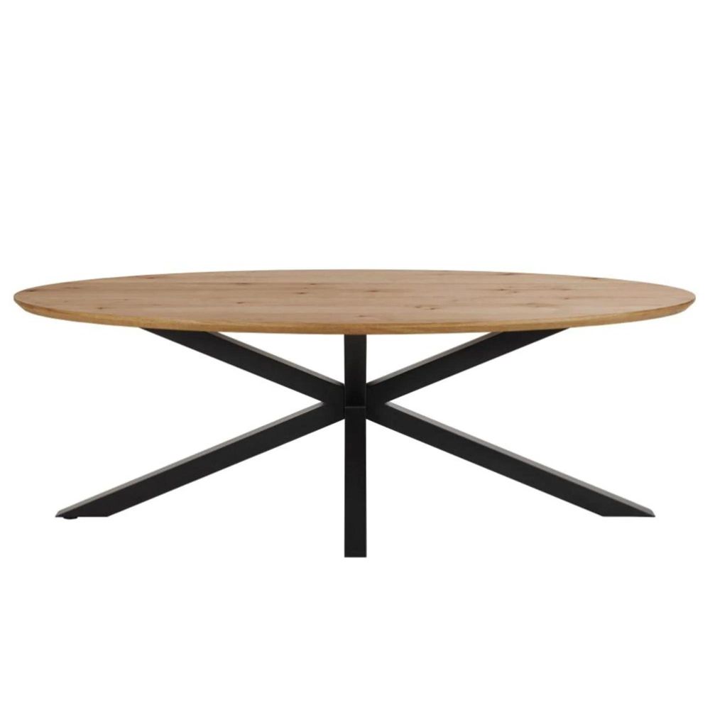 Item Code: H000022579 Heaven oval dining table, top wild oak oiled veneer, 4-star base matt black rough powder coated steel. With an oval tabletop and a sculptural base, this dining table will demand attention in any dining room. Thanks to the organic shape of the oak veneer tabletop, the table looks inviting. The cross steel base not only draws attention it also balances out the tabletop.Free Delivery
