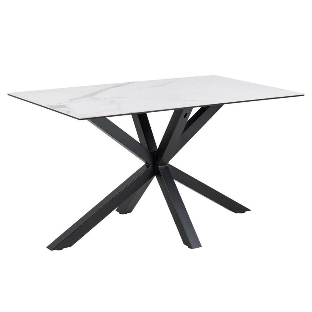 Item Code: H000022899 Heaven rectangular dining table, top white Akranes rough ceramic, 4-star base matt black rough powder coated steel. The ceramic dining table offers balanced aesthetics as well as generous space for 4 people. Designed with a heat and scratch-resistant ceramic tabletop in white marble look and a sculptural black cross base this table has a modern expression and is easy to maintain as well. Such characteristics make the design an ideal addition to any home.Free Delivery