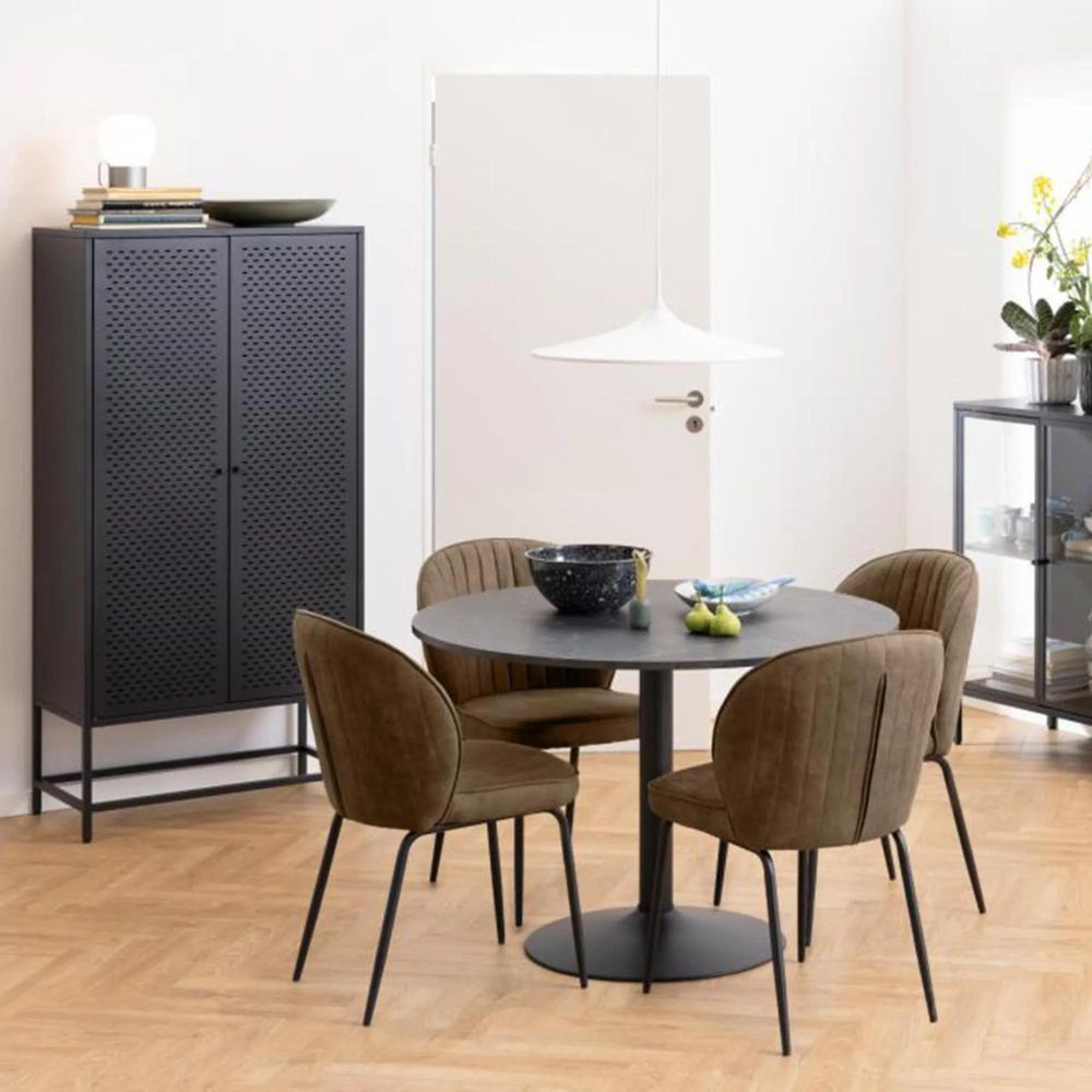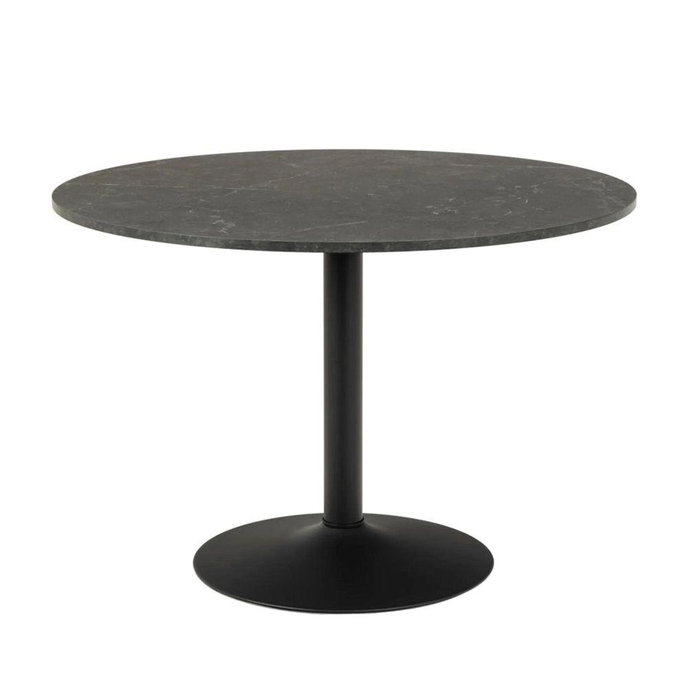 Item Code: H000024901 Ibiza round dining table, top matt black Izmir rough melamine, trumpet base matt black rough powder coated steel. Characterised by its minimalistic design, this round dining table comfortably seats 4 people. Its dimensions make it ideal for smaller dining areas, helping to maximise space. The black marble look enhances the table's appeal, while the round trumpet base made of steel complements the top. This well-balanced table is suitable for any occasion.Free Delivery