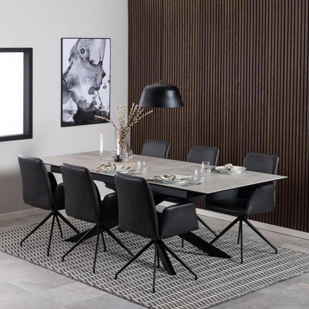 Item Code: H000023567 Irwine rectangular dining table, top grey Anista rough ceramic, 4-star base matt black rough powder coated steel with extension leaf storage and synchronous extension. Featuring a grey ceramic top, the surface of this dining table looks good, is heat and scratch-resistant and can easily be extended thanks to the synchronous extension. Just pull gently on the table's end, and the extension will appear in the middle. The look is completed with the black cross steel base for a dramatic effect.Free Delivery