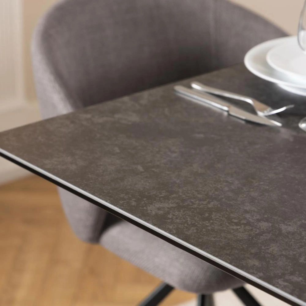 Item Code: H000022873 Irwine rectangular dining table, top black Fairbanks rough ceramic, 4-star base matt black rough powder coated steel with extension leaf storage and synchronous extension. Look at that black ceramic tabletop giving serious industrial vibes. The surface is heat and scratch-resistant and the table can easily be extended thanks to the synchronous extension. Just pull gently at the end of the table, and the matching extension will appear in the middle.Free Delivery
