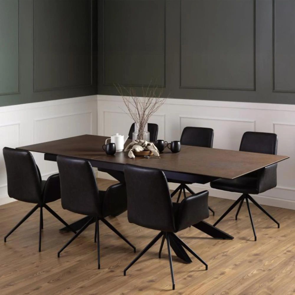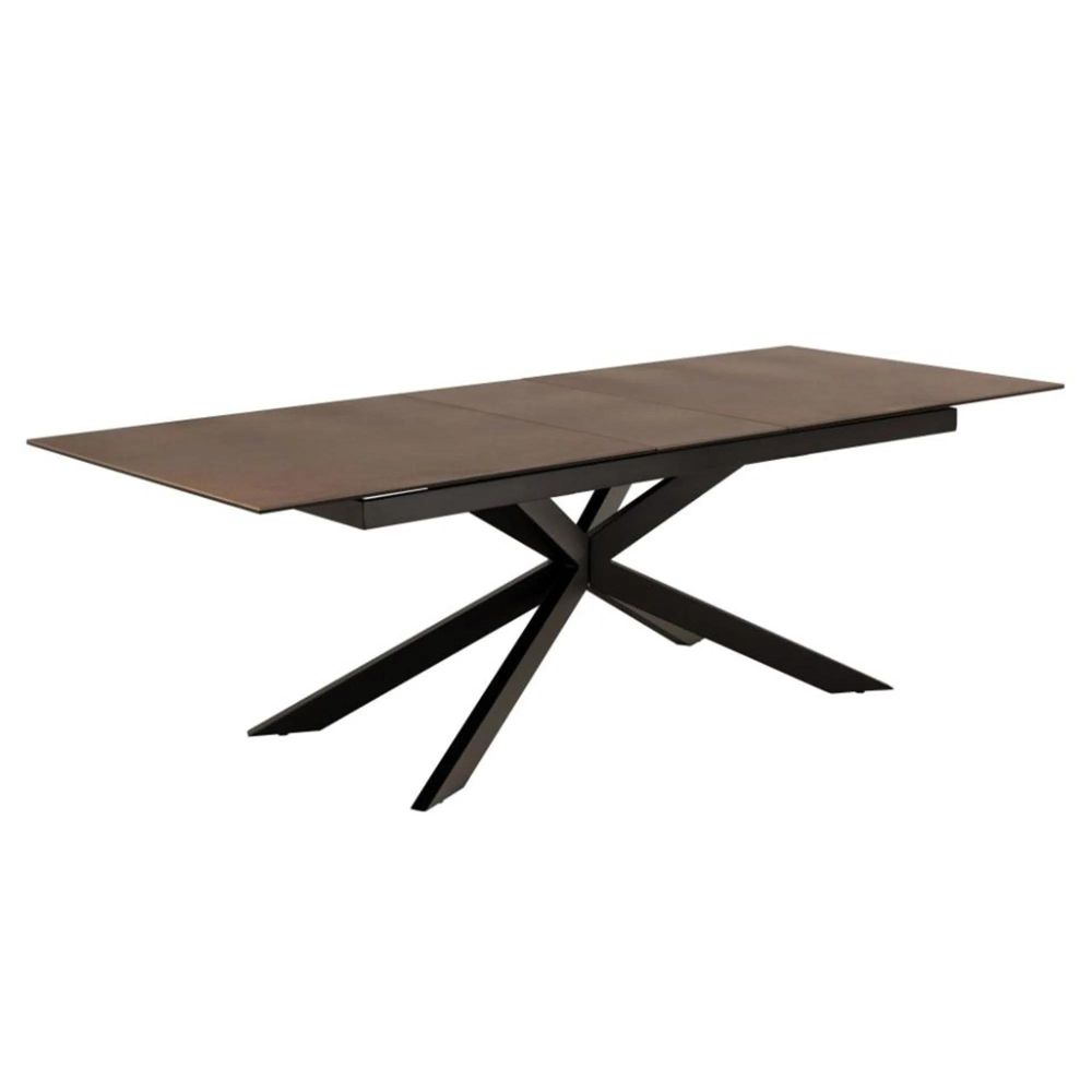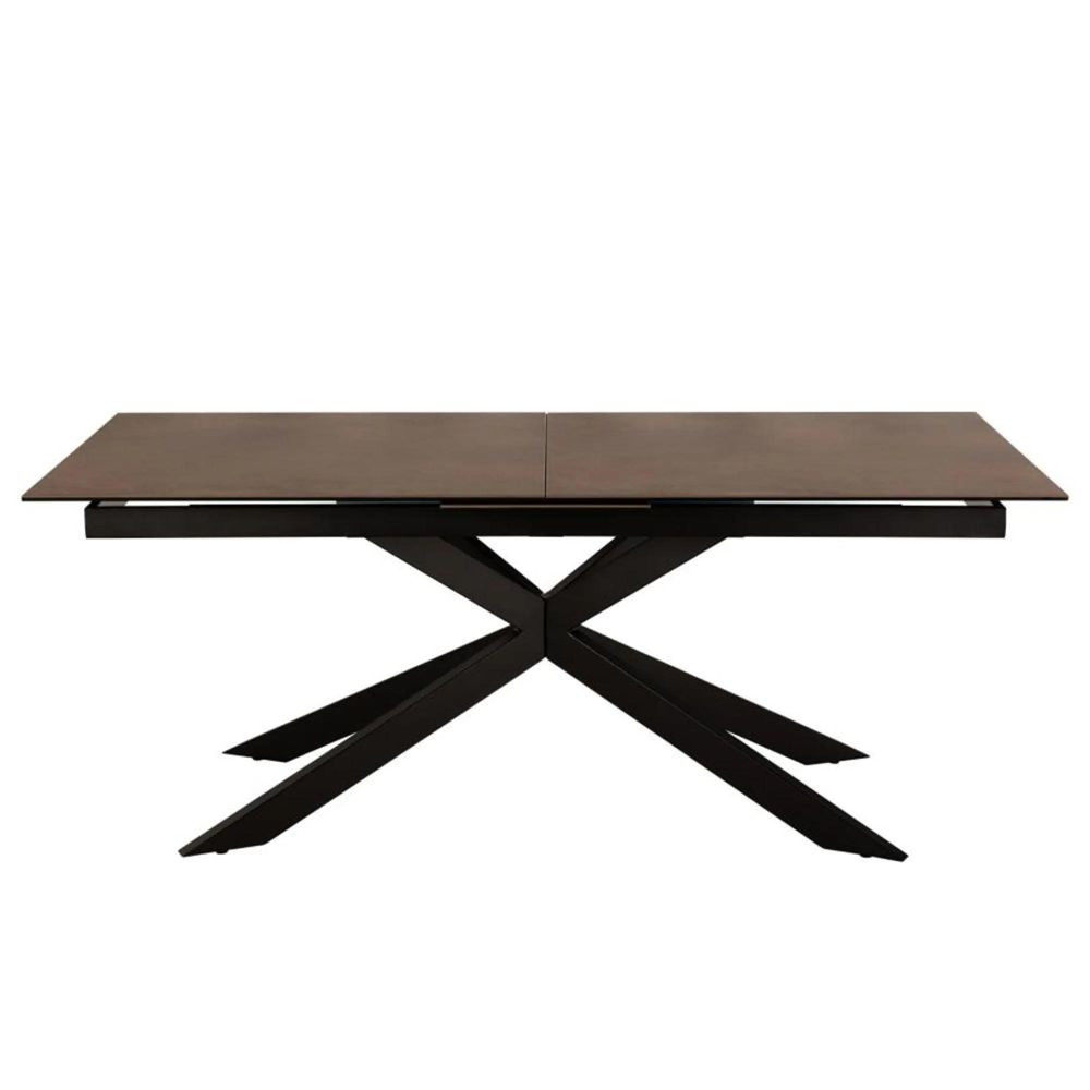 Item Code: H000022635 Irwine rectangular dining table, top rusty brown Lemco rough ceramic, 4-star base matt black rough powder coated steel with extension leaf storage and synchronous extension. Look at that rusty brown ceramic tabletop giving serious industrial vibes. The table can easily be extended thanks to the synchronous extension. Just pull gently at the end of the table, and the matching extension will appear in the middle. The look is completed with the cross black base positioned in a way that allows sitting comfortably around the table.Free Delivery