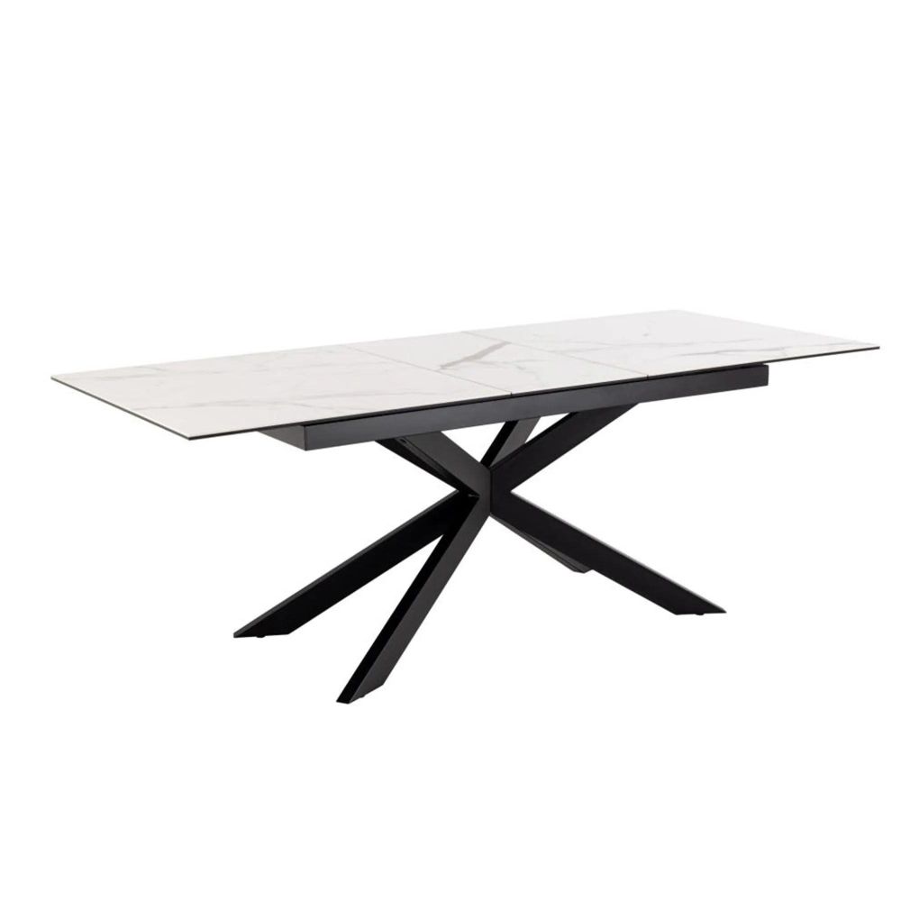 Item Code: H000023565 Irwine rectangular dining table, top white Akranes rough ceramic, 4-star base matt black rough powder coated steel with extension leaf storage and synchronous extension. Featuring a white ceramic top, the surface of this dining table looks good, is heat and scratch-resistant and can easily be extended thanks to the synchronous extension. Just pull gently on the table's end, and the extension will appear in the middle. The look is completed with the black cross steel base for a dramatic effect.Free Delivery