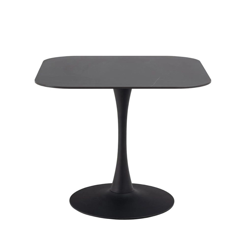 Item Code: H000024292 Malta square dining table, top matt black Grantham ceramic, trumpet base matt black rough powder coated steel. This square dining table with rounded corners will keep the conversation going. With a round base, the black table has a light and floating look. But it is not all style - the ceramic top also practical. Ceramic is heat and scratch-resistant material requiring low maintenance. Stunning and practical - just how it should be. FSC certified.Free Delivery