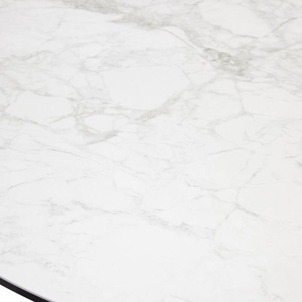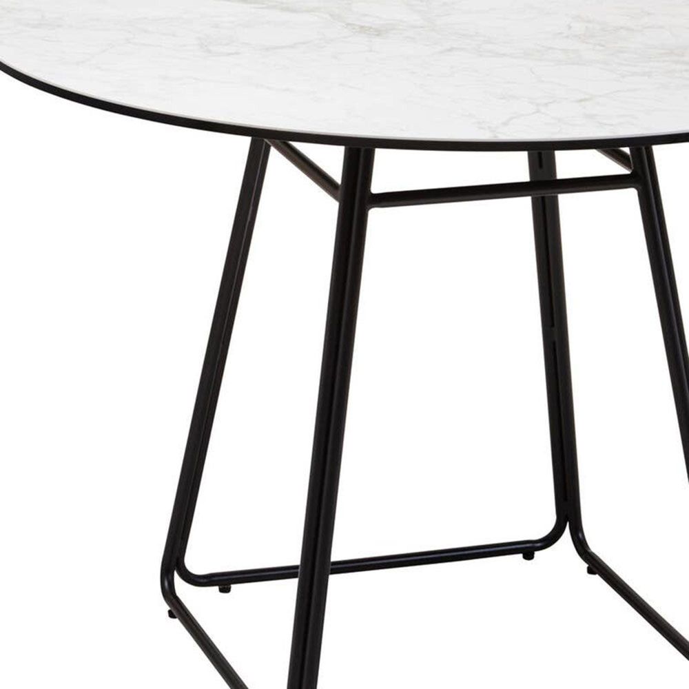 Item Code: 5528865 This round dining table features a stylish white marble effect ceramic top and sleek black coated iron legs for a modern aesthetic.The Imperia dining table presents a combination of textures and materials featuring a white marble effect ceramic top, offering a stylish and durable surface. It's supported by elegant black coated iron legs, creating a modern and airy design.