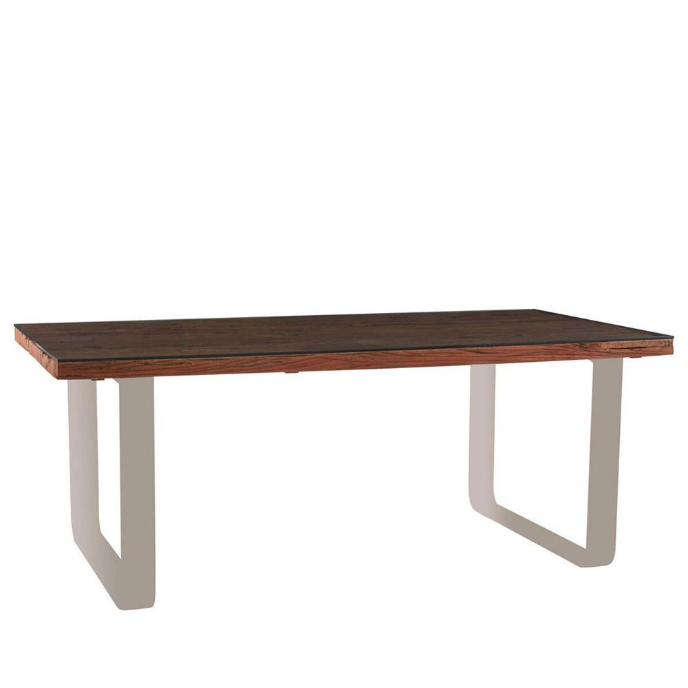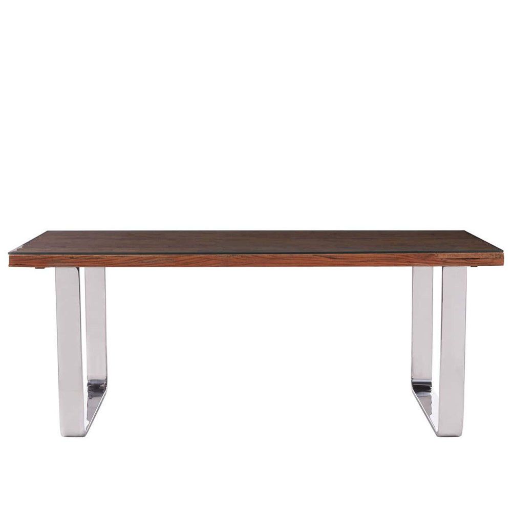 Item Code: 5527842 This dining table will complement modern living interior with the simple form and minimalist base.Expertly handcrafted, this dining table features a rectangular salvaged wood top accenting clear glass slab on it. Made from silver finish stainless steel, U-shaped sled base offers a tonal contrast to the natural warmth and texture.