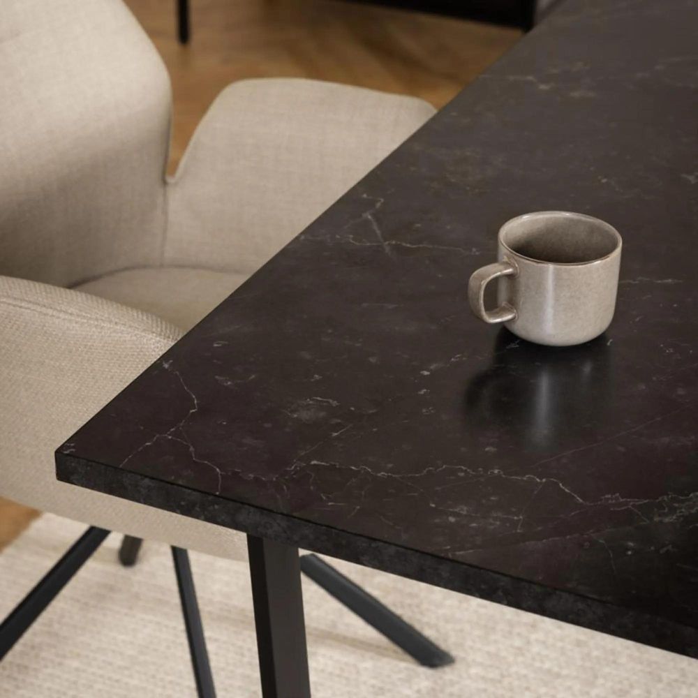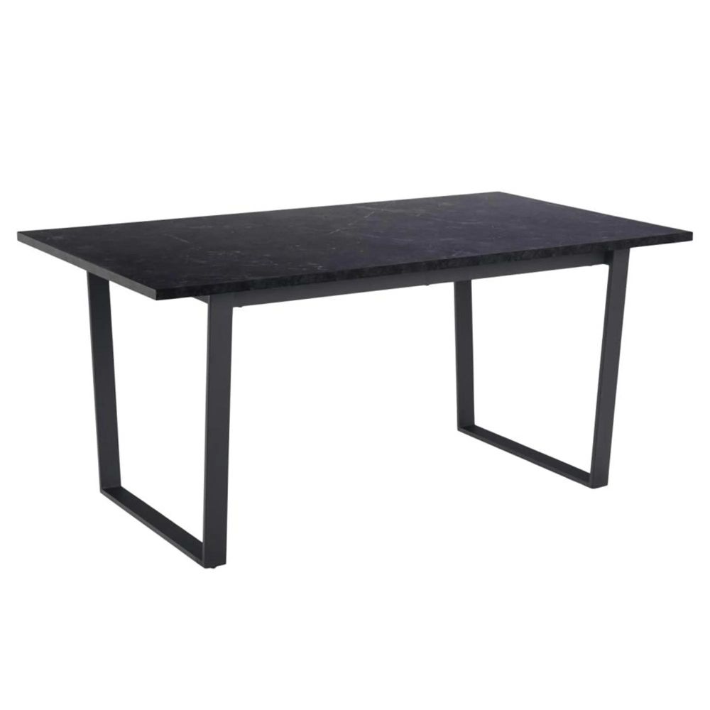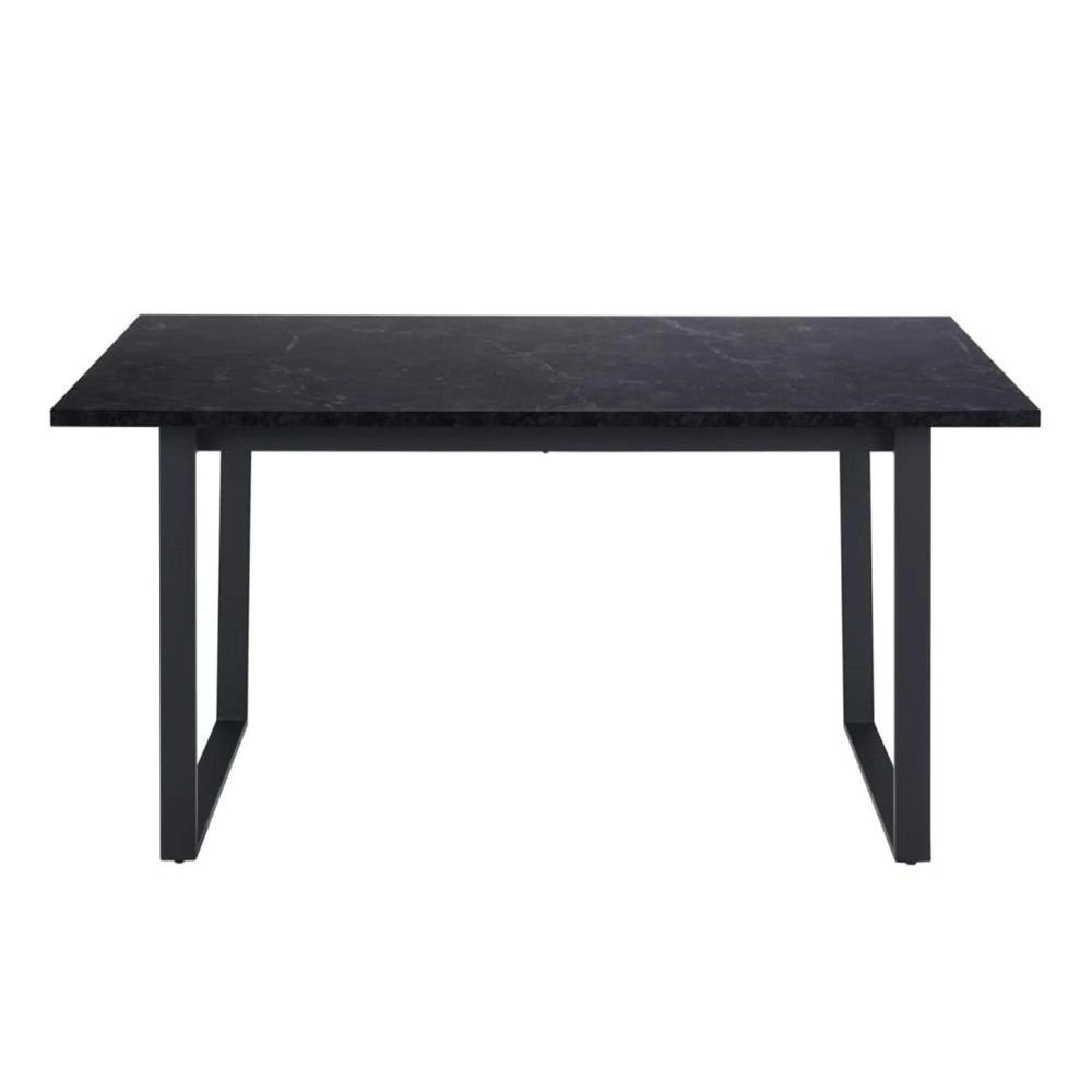 Item Code: 89381 Amble rectangular dining table, top black marble Izmir melamine, sledge base matt black rough powder coated steel. Personalize your dining area with this modern table with black marble look. Made of metal and melamine this table is both visually appealing as well as durable. Just check out the U-shaped metal legs for an industrial look.Free Delivery