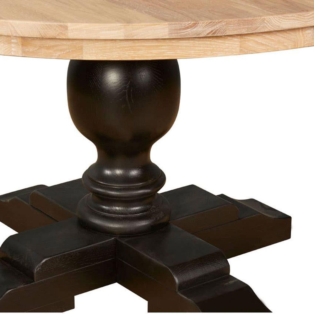 Item Code: 5501652 The Lyon dining table is made from solid American oak and boasts a contrasting accent with dark base and natural top.Its round top is lightly coloured and features a prominent grain that creates a textured finish. The pedestal base is coloured black to contrast with the top, and boasts four chunky feet and a bulbous central section. Coordinate it with the Lyon cabinet.