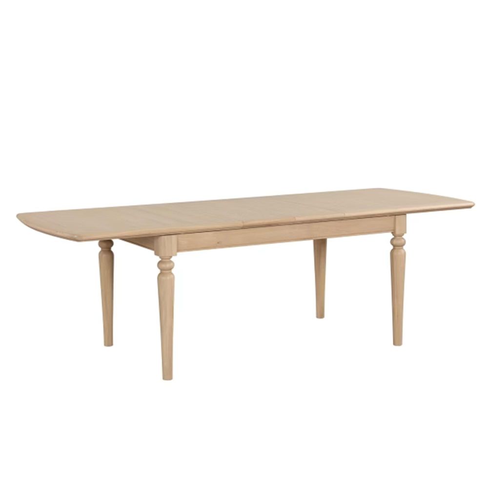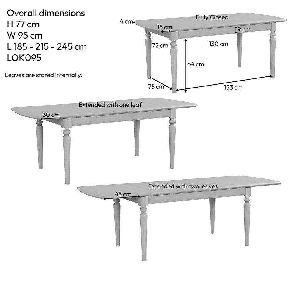 Item Code: LOK095 Host in style with this generously sized extending dining table. The beautifully engineered oak top expands from 185cm to 215cm or 245cm with the use of one or two internal leaves. Featuring classic turned legs and smooth extension runners, it's built for lasting beauty and everyday practicality.