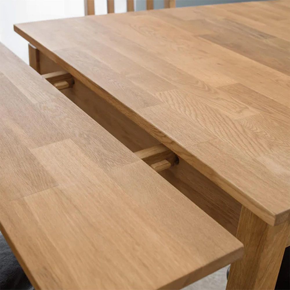 Item Code: COX012 The Coxmoor extending dining table has been beautifully crafted from the finest, solid white oak, for a natural and traditional look to your dining room. The dining table has a rich oiled finish for added durability and to enhance the woods real natural grain. Featuring a retractable leaf extension system that is easy to use and stores within the table when not in use.