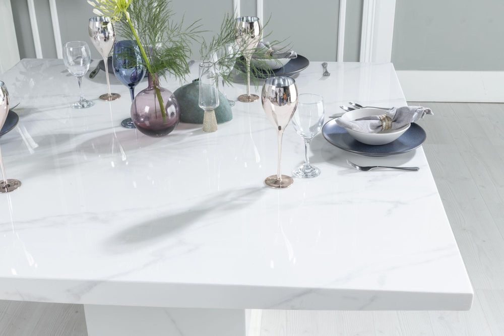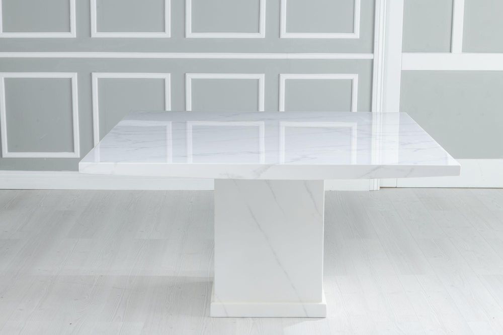 At the heart of its design lies a sculptural white marble pedestal base supporting a sleek square marble tabletop with a clean pencil-edge finish. The polished white marble radiates sophistication with its glossy surface and natural veining, offering a premium look that complements modern interiors. At 140cm, it comfortably seats eight, perfect for both stylish dinner parties and everyday family meals.
