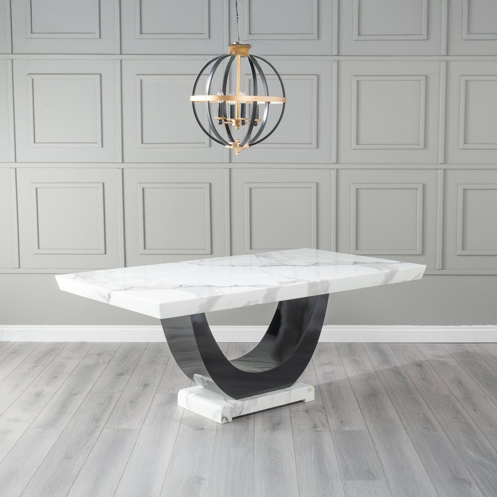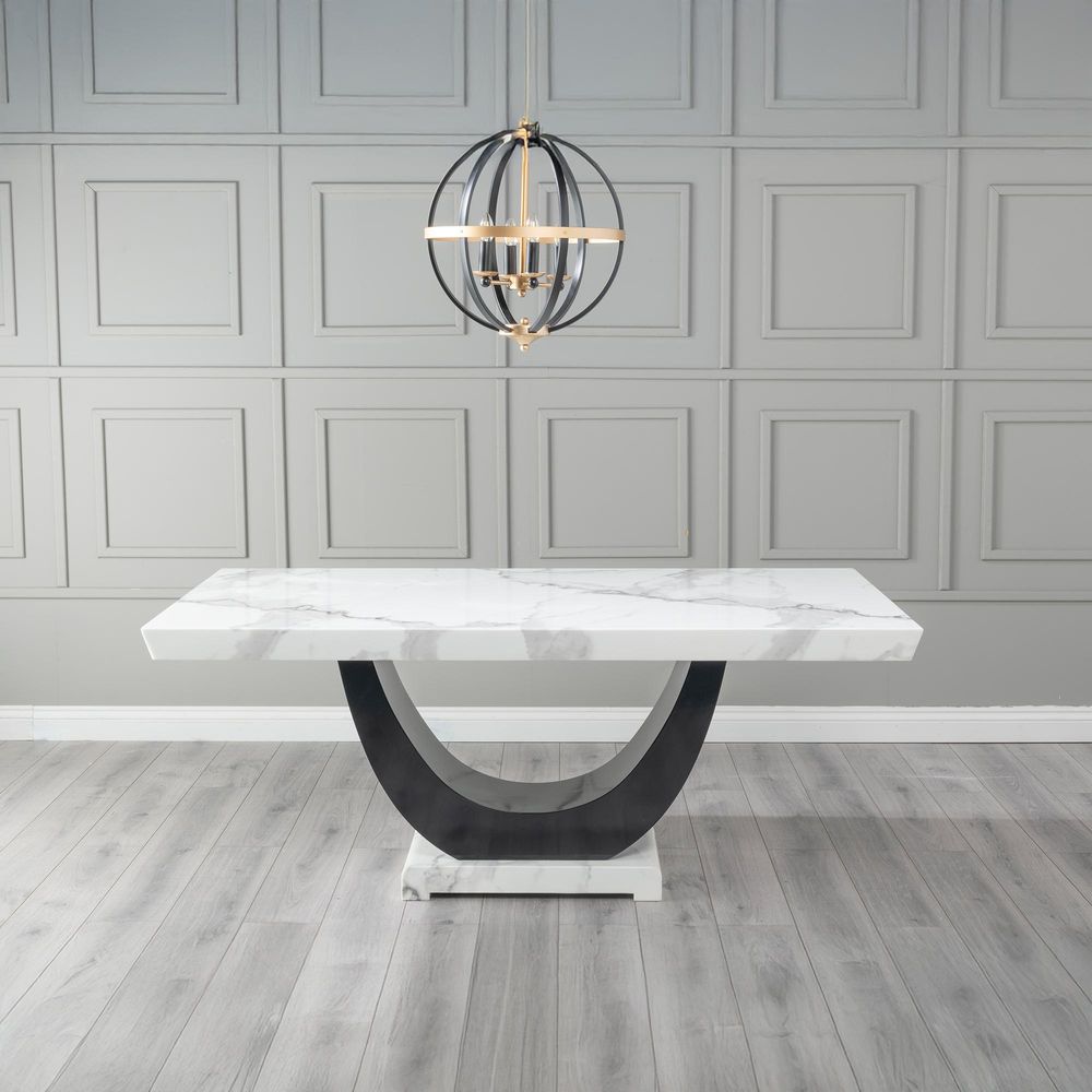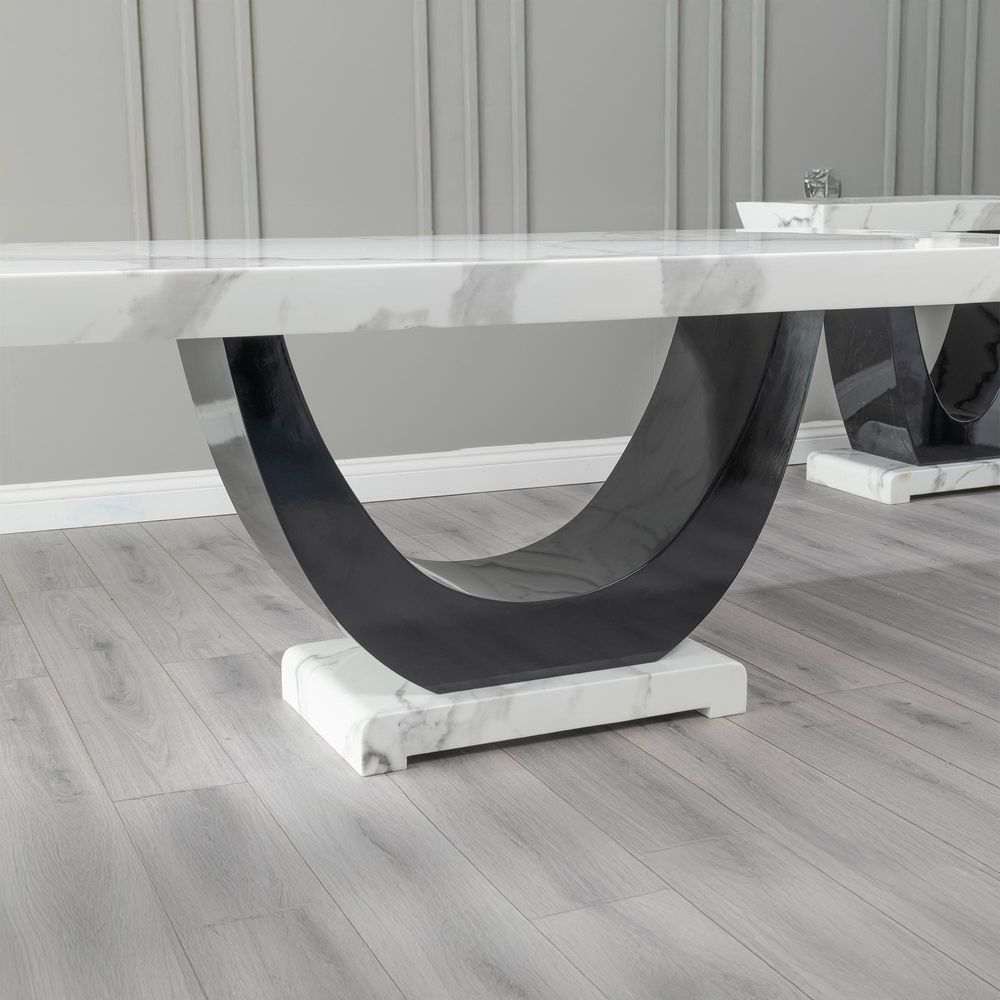 The sleek white marble tabletop features a bevelled edge and a glossy finish, offering an opulent surface that enhances both everyday meals and grand gatherings. Its distinct curved black gloss pedestal base provides a sculptural foundation, adding architectural beauty to your space while ensuring robust stability.