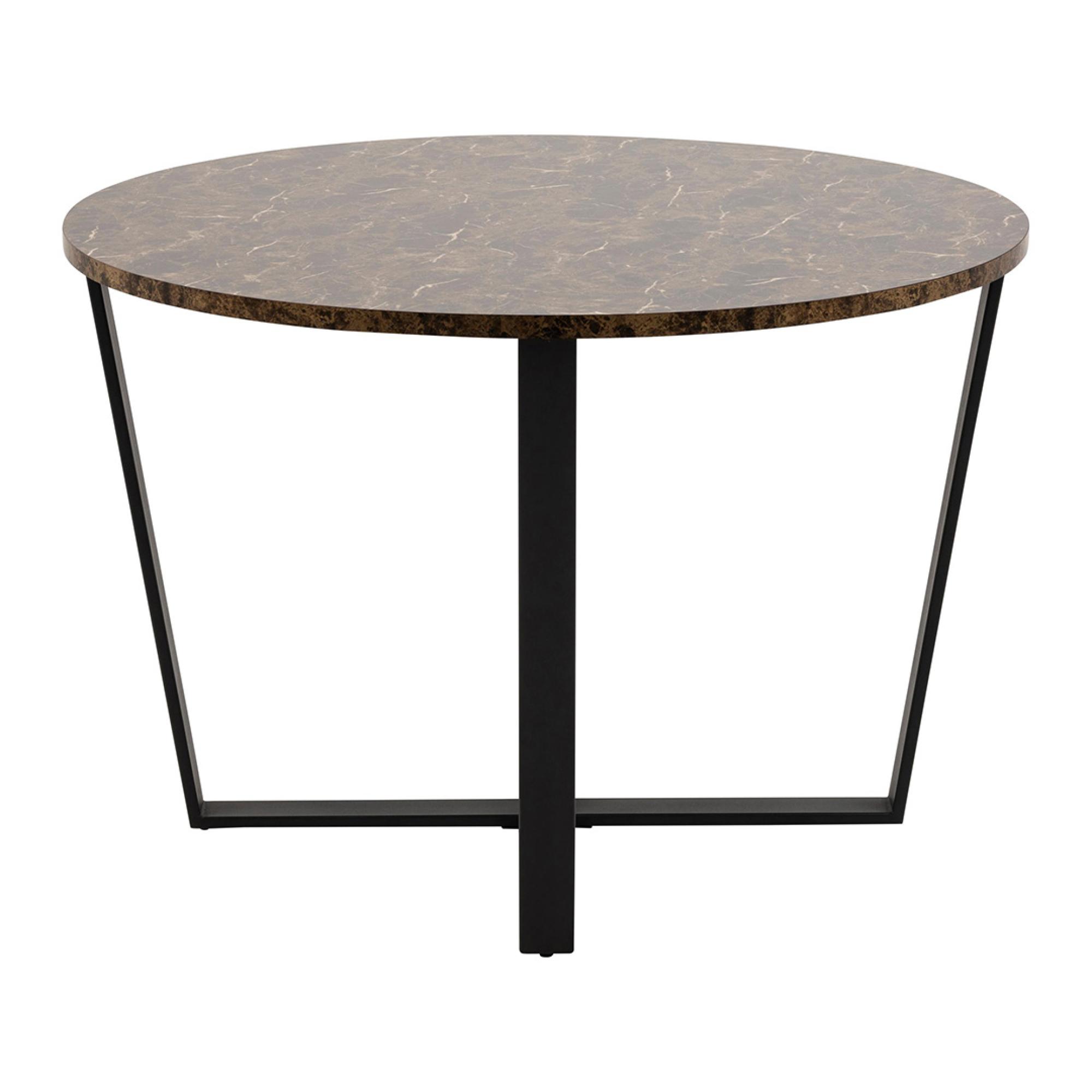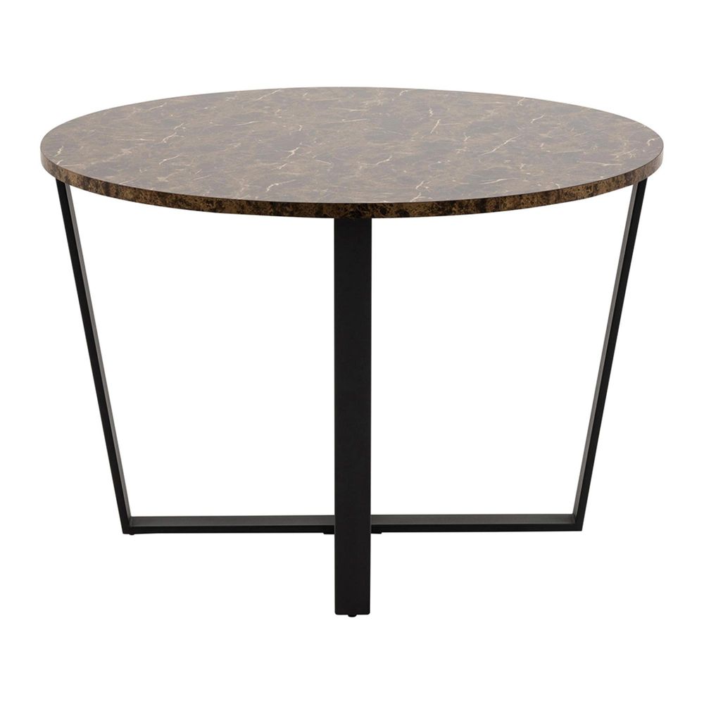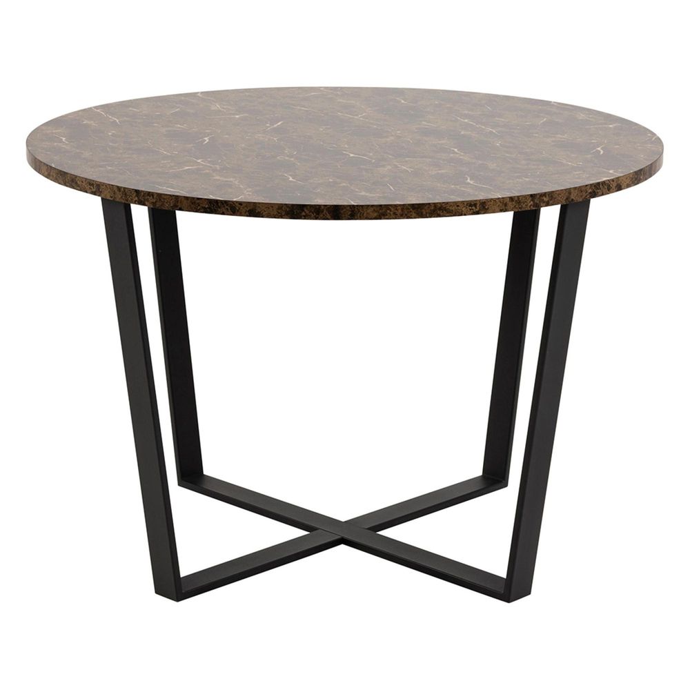 Item Code: 84697 This stylish dining table is ideal for the modern home. Featuring a marble effect top with matt black metal legs, it will provide a striking addition to your dining area. The round shape allows for convenient seating of up to four people. Finished with flat packed assembly for easy setup, and a sleek brown and black colour scheme, this contemporary piece will be the perfect focal point to dine and entertain guests in your home.